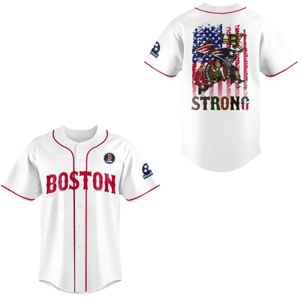 The jersey is a visual masterpiece dedicated to the culture of Massachusetts sports. The front of the jersey features a clean, classic aesthetic with crisp red piping framing the traditional “BOSTON” lettering across the chest. A dedicated “B Strong” commemorative patch rests proudly on the upper left chest, instantly establishing the garment’s underlying theme of resilience.