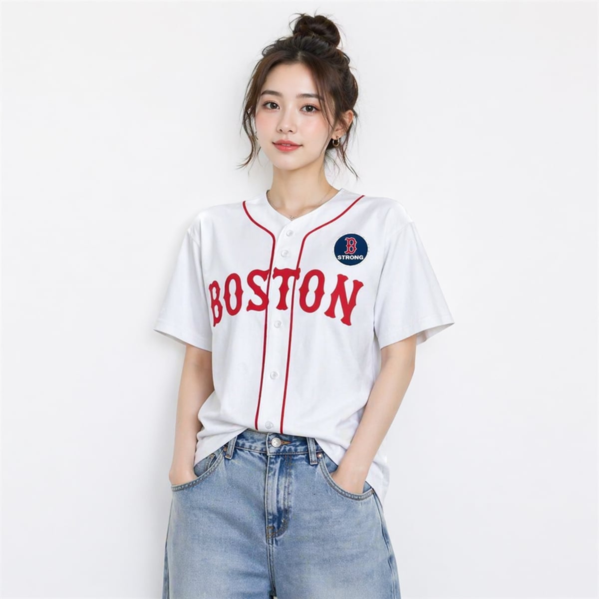 The jersey presents a masterclass in classic baseball aesthetics combined with profound civic pride. The design is anchored by a crisp, traditional white base, contrasted beautifully by the bold, vibrant red “BOSTON” lettering arching across the chest. Classic red piping runs seamlessly down the placket and around the collar, framing the uniform with a timeless, vintage-inspired look.