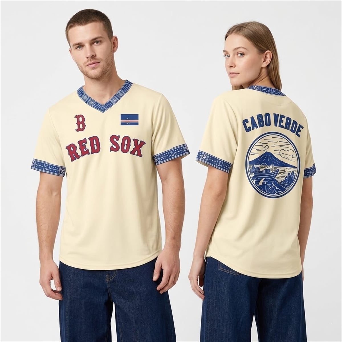 The jersey is a striking piece of commemorative apparel designed with an eye-catching cream base that allows its vibrant details to stand out. The front of the jersey features the classic Boston “B” logo on the right chest and the iconic “RED SOX” lettering across the midsection in traditional red with navy borders. Positioned proudly on the left chest is the flag of Cabo Verde, instantly establishing the theme of the garment. The collar and sleeve cuffs are adorned with a customized navy blue trim containing intricate anchor and geometric motifs, elevating the visual appeal beyond standard team merchandise.