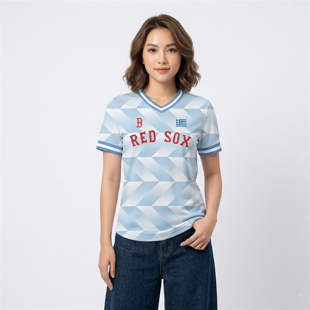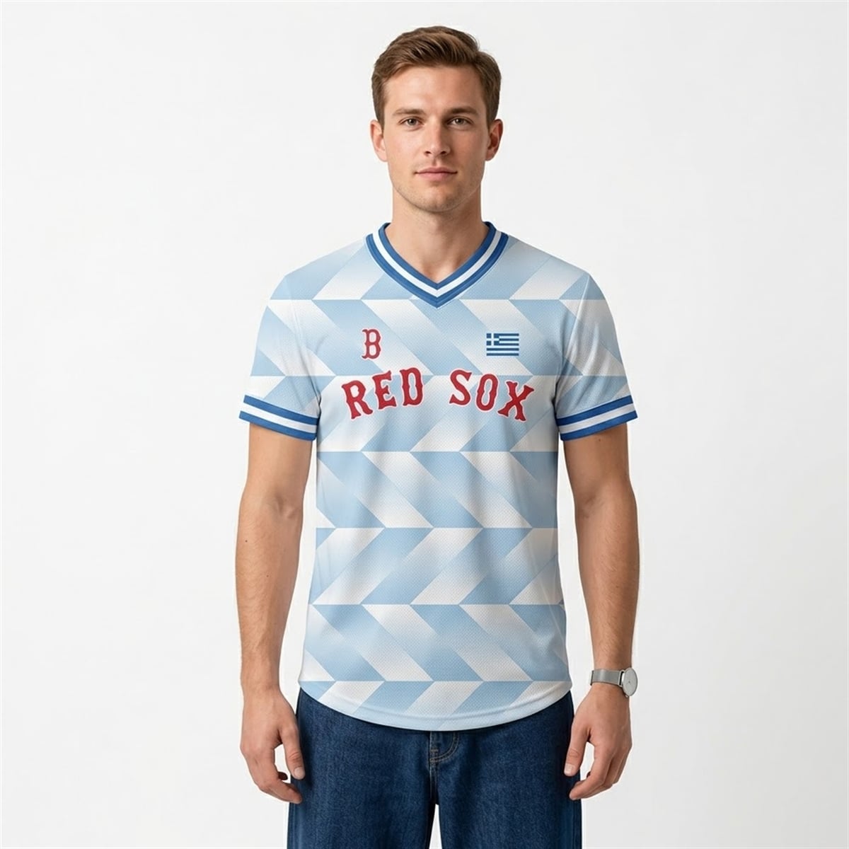 The jersey is a monumental release in the realm of sports-meets-culture apparel. Moving away from standard team colorways, this design introduces a breathtaking light blue and white color palette, meticulously arranged in an eye-catching chevron layout. The iconic Red Sox typography and the legendary “B” are proudly displayed in their traditional crimson, creating a brilliant, high-contrast visual pop against the serene background. Finished with the Greek flag elegantly positioned on the upper chest, this item is a visual masterpiece tailored for the modern sports enthusiast.