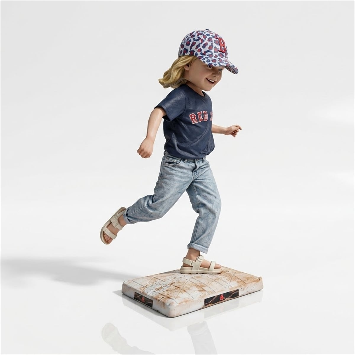 The bobblehead is a visually captivating piece of sports memorabilia that freezes a moment of pure fan excitement. The figure features a joyful young fan mid-stride, energetically stepping across a wonderfully scuffed and realistically weathered baseball base. The character is styled in contemporary fan apparel, sporting a trendy leopard-print Red Sox cap with the iconic ‘B‘ logo, a classic navy “RED SOX” t-shirt, casual rolled-up jeans, and summer sandals.