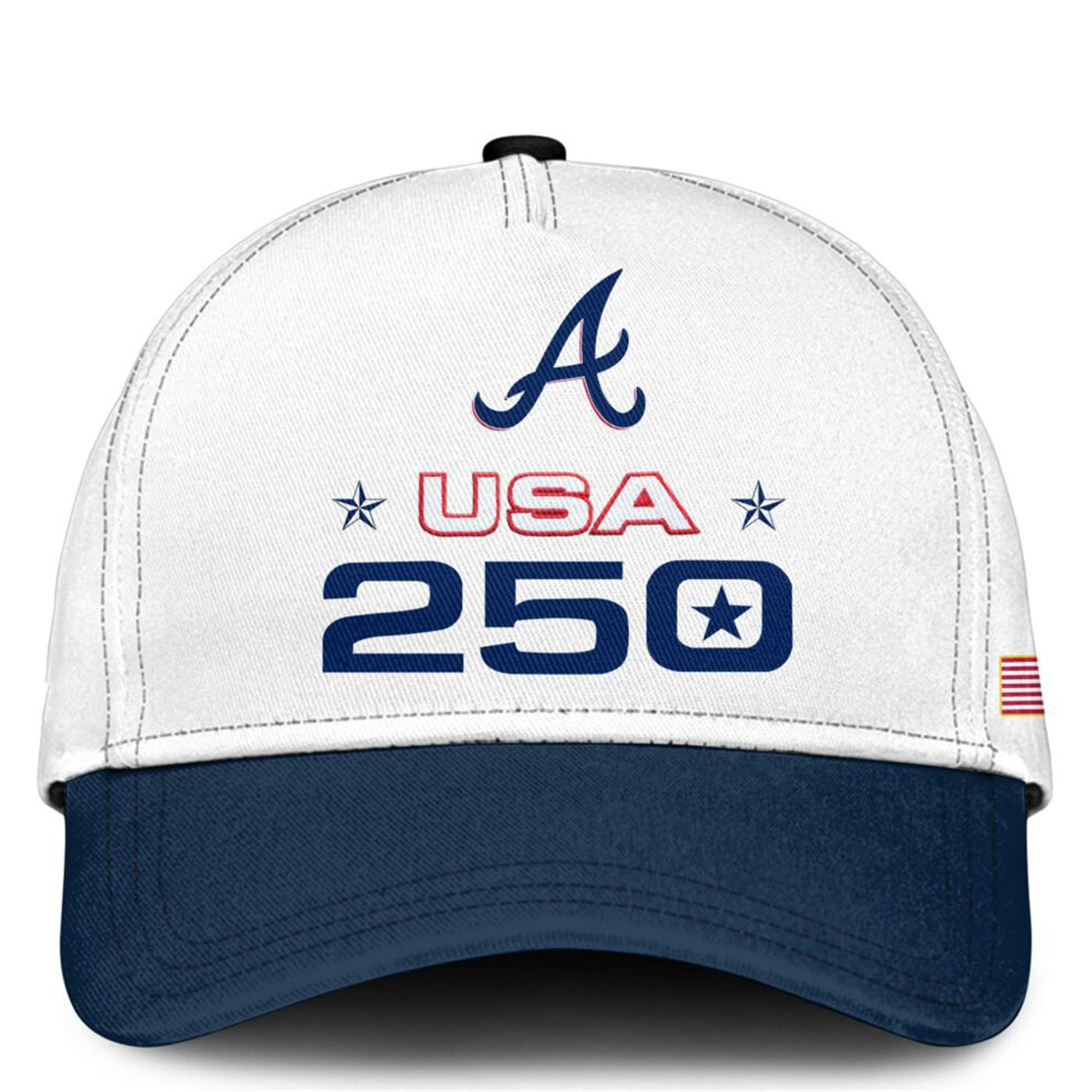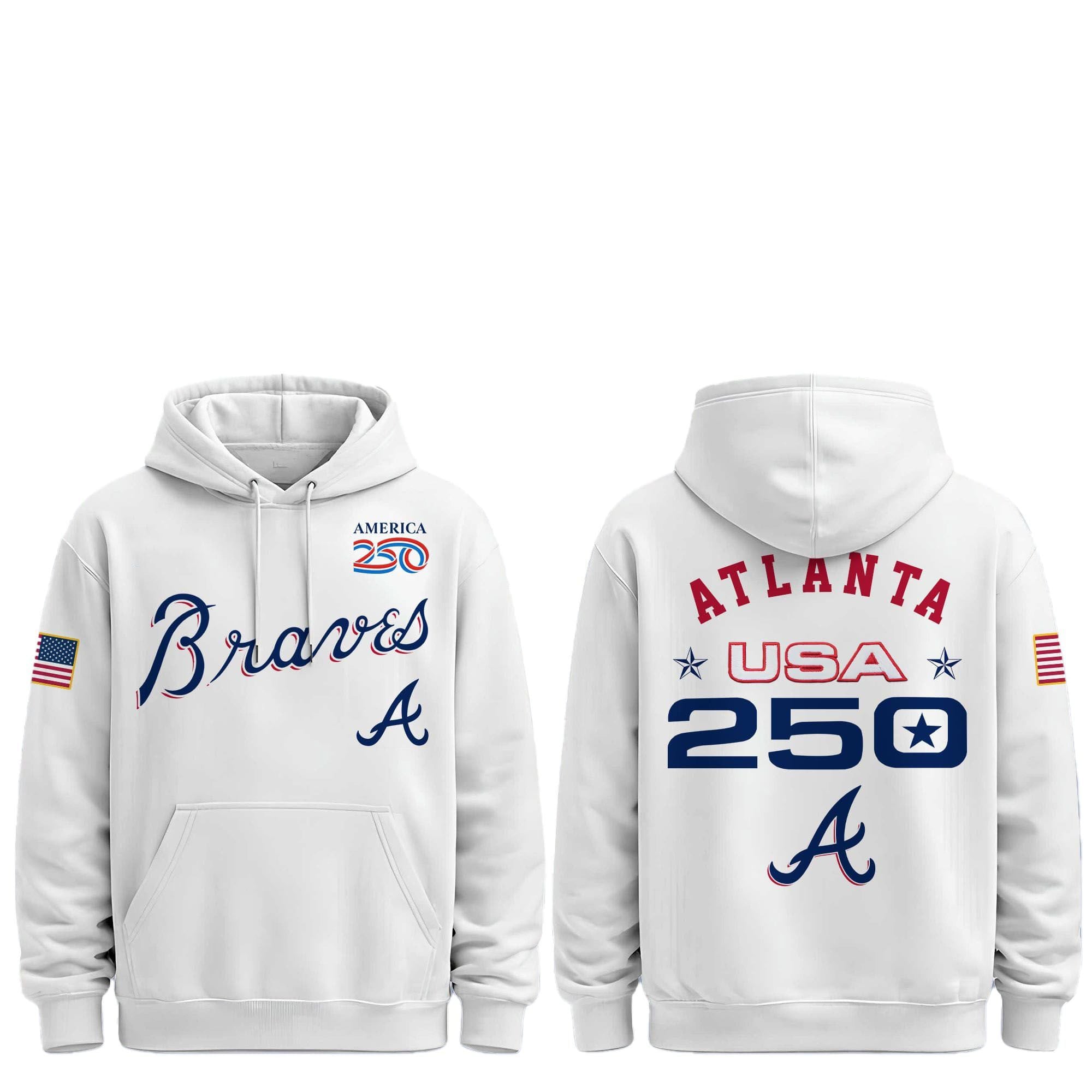 The year 2026 marks a pivotal moment in history—the United States Semiquincentennial. This hoodie serves as the perfect canvas for this celebration, specifically curated for the dedicated Atlanta fan. The design philosophy centers on a “Clean White” aesthetic that allows the patriotic colors to pop. On the front, the classic Navy Blue “Braves” script is reimagined with subtle red and white accents, flanked by the style “America 250” commemorative logo. This isn’t just a nod to the team; it is an acknowledgement that Atlanta is a central hub for American culture and history.