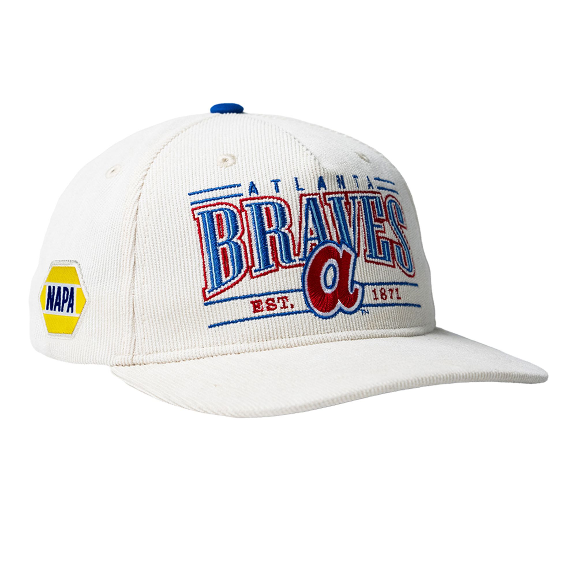 The cap is a striking piece of limited-edition sports apparel that pays homage to the rich visual history of the franchise. The cap features a crisp, cream-colored base that perfectly frames the vibrant, retro-styled “Atlanta BRAVES” wordmark emblazoned across the front crown. Prominently displaying the historic “EST. 1871” detail alongside the classic lowercase “A” logo, the design is a masterful nod to the team’s deep-rooted origins. A striking blue top button provides a pop of contrast, while the iconic yellow and blue NAPA hexagonal sponsor patch on the right panel authenticates its status as a rare 2026 promotional stadium giveaway.