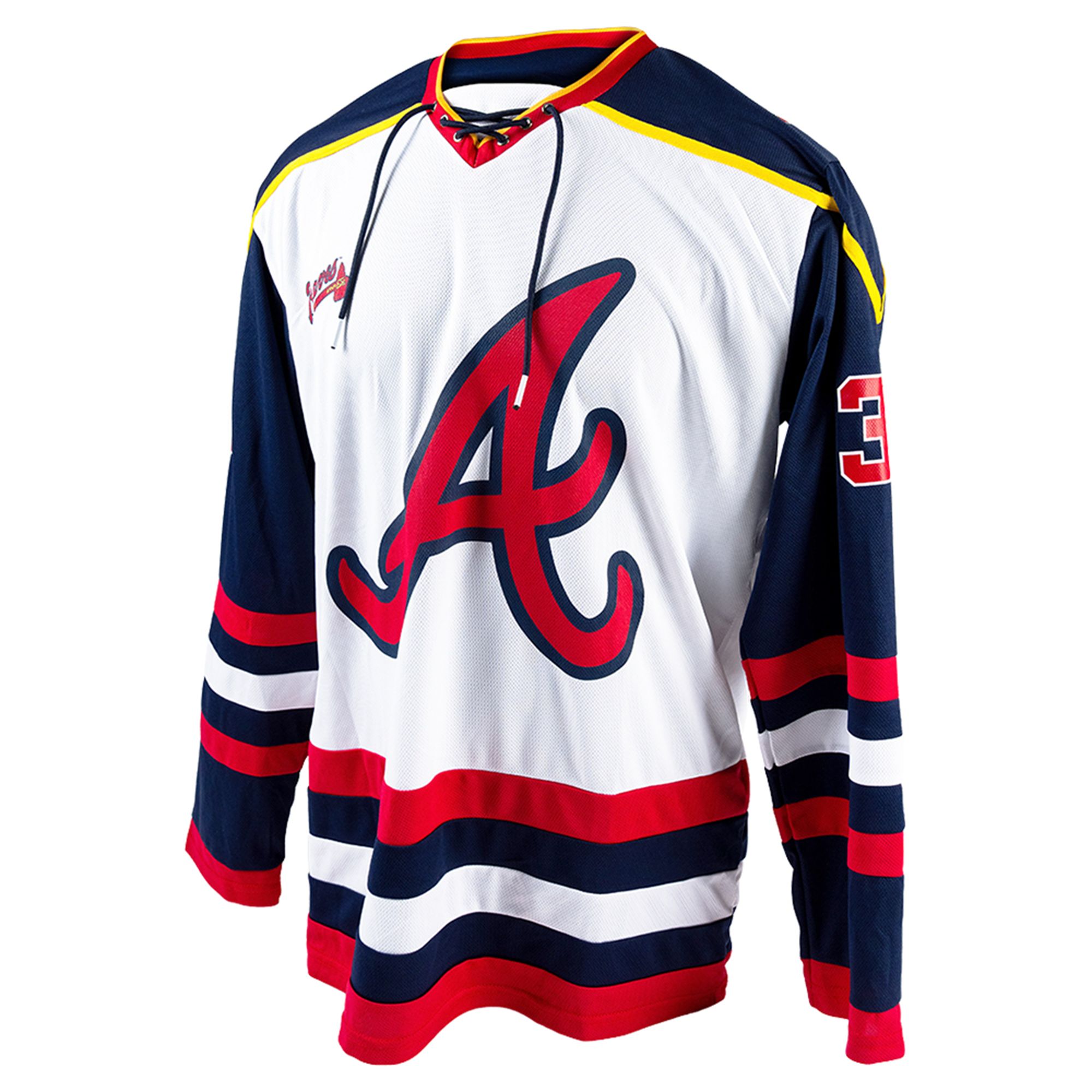 True to classic hockey styling, the jersey incorporates bold, thick striping. Vibrant red and navy bands wrap around the lower waist and the lower sleeves, creating a dynamic, athletic silhouette. The look is completed with a traditional lace-up neck design featuring navy strings, and the number 3 proudly displayed on the sleeve to honor Drake Baldwin. The fusion of these design elements creates a piece that is visually loud, historically unique, and instantly recognizable.