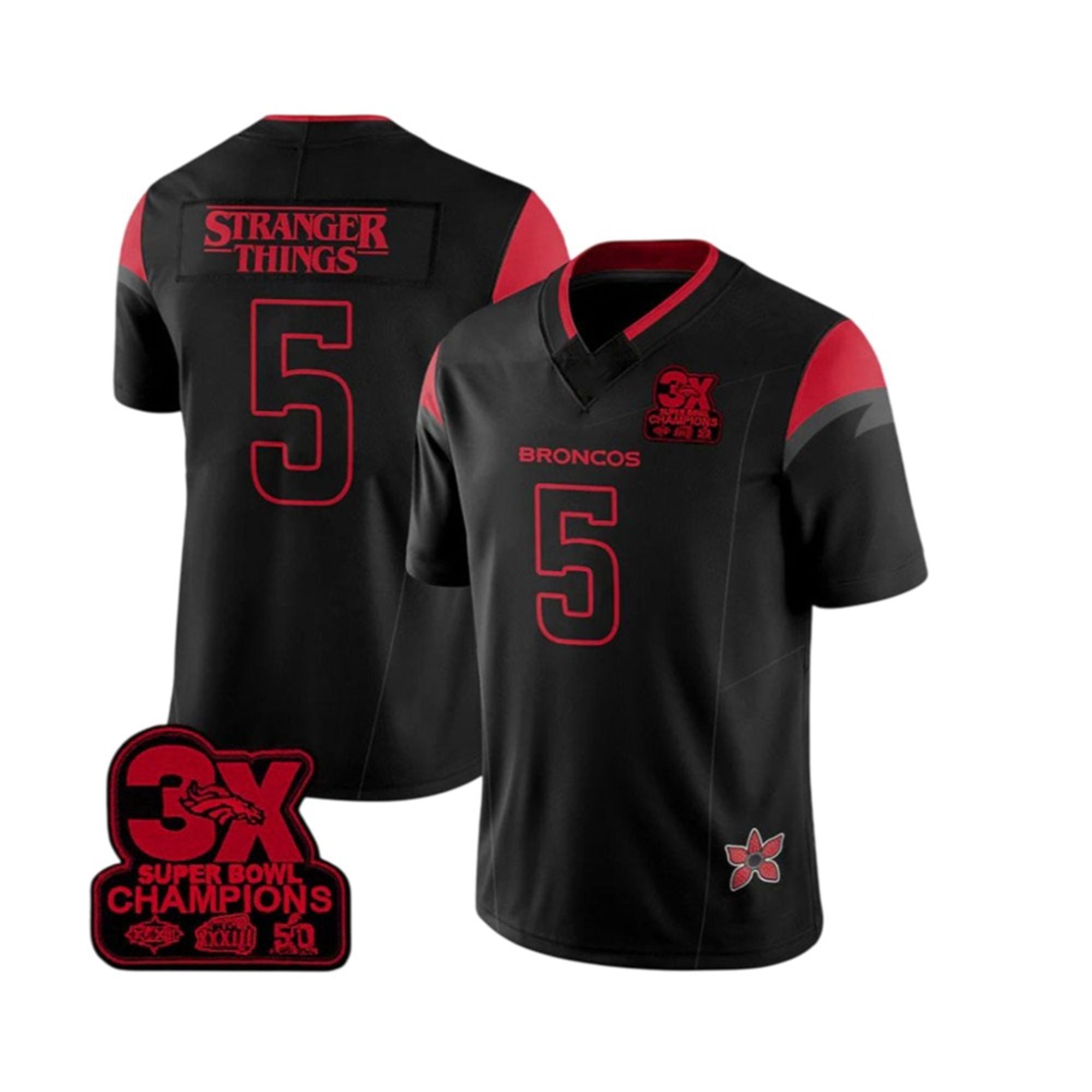 The design is electrified with neon-red accents on the collar, sleeves, and typography, mirroring the show’s signature retro-horror opening sequence. The front proudly displays “BRONCOS” above a bold Number 5—a nod to the highly anticipated Season 5—while the left chest is adorned with a custom 3X Super Bowl Champions patch. This patch honors the team’s historic victories in Super Bowls XXXII, XXXIII, and 50, grounding the sci-fi fantasy in real greatness.