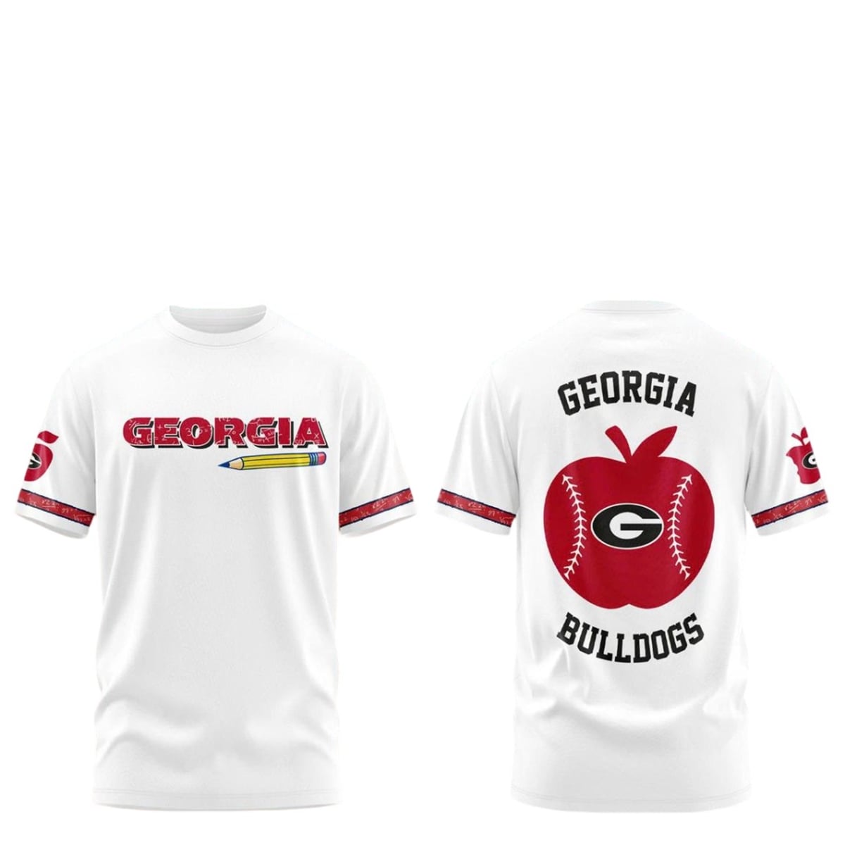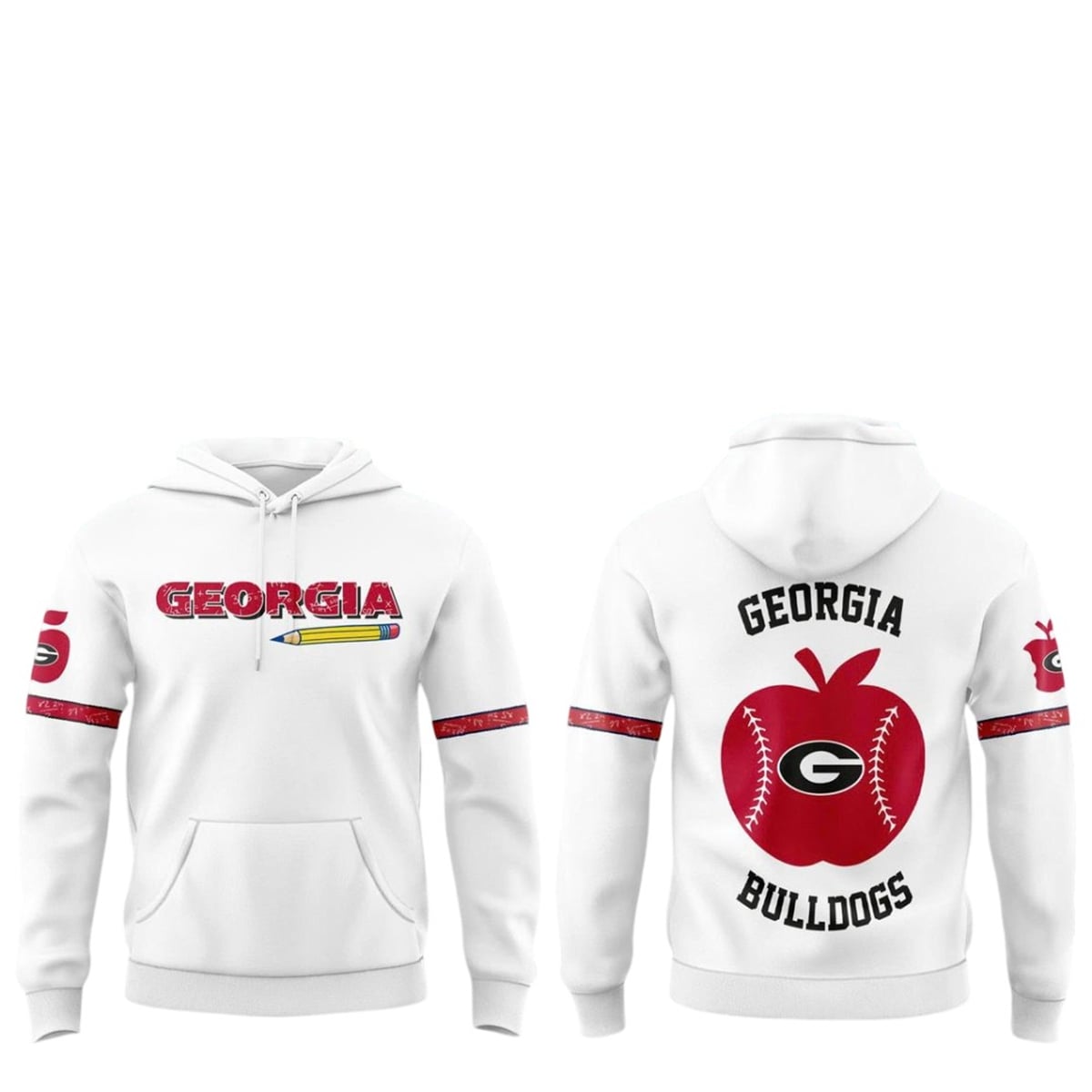 This eye-catching red hoodie is a masterclass in thematic design, specifically created for the 2026 Teacher Appreciation Night. The front boldly displays “GEORGIA” in a classic collegiate font, underlined by a vivid yellow pencil graphic that immediately establishes the educational theme. The sleeves feature distinct white banding detailed with intricate math equations, adding a subtle nod to STEM and academic rigor. Turning to the back, the apparel reveals its centerpiece: a massive “GEORGIA BULLDOGS” arch over a creative graphic that merges a traditional teacher’s apple with a baseball, complete with red stitching and the iconic UGA “G” logo front and center.