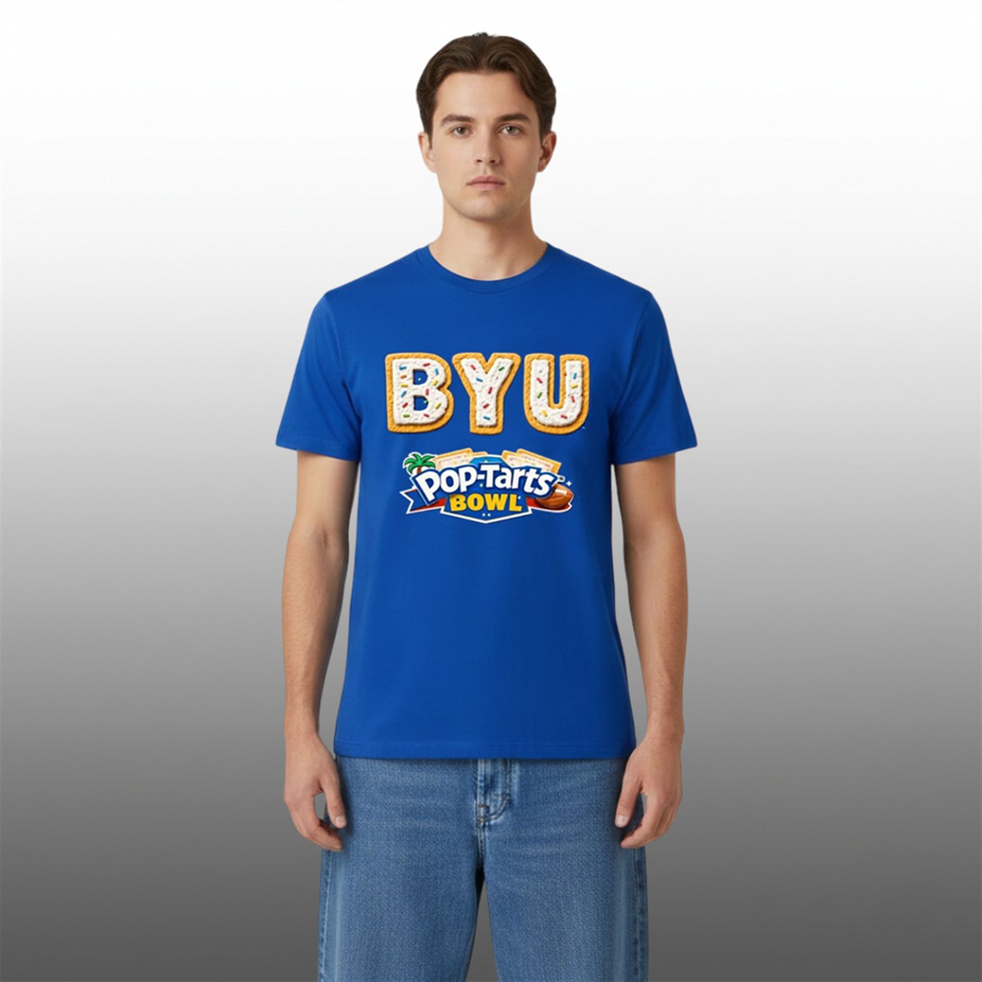 This isn’t your average game day t-shirt. The shirt stands out with a creative design that mimics the texture of a toaster pastry. The massive “BYU” lettering across the chest is rendered to look like golden-baked crust, topped with generous white frosting and colorful rainbow sprinkles. It’s a playful nod to the “Edible Mascot” and the viral fame of the Pop-Tarts Bowl, making it an instant collector’s item for fans who appreciate unique sports memorabilia.