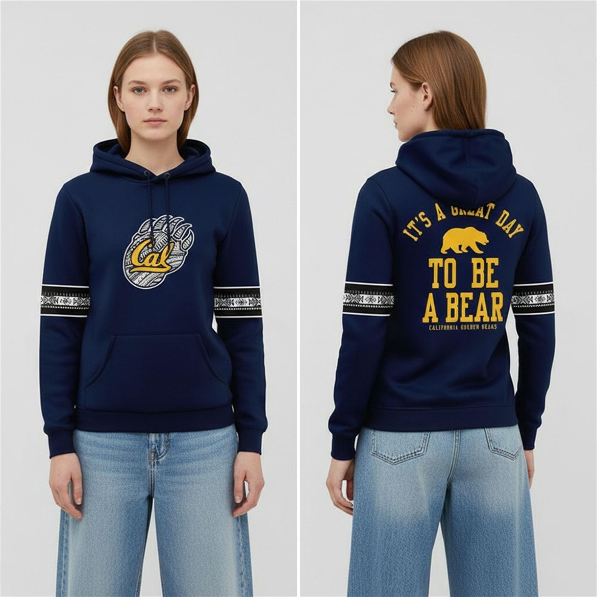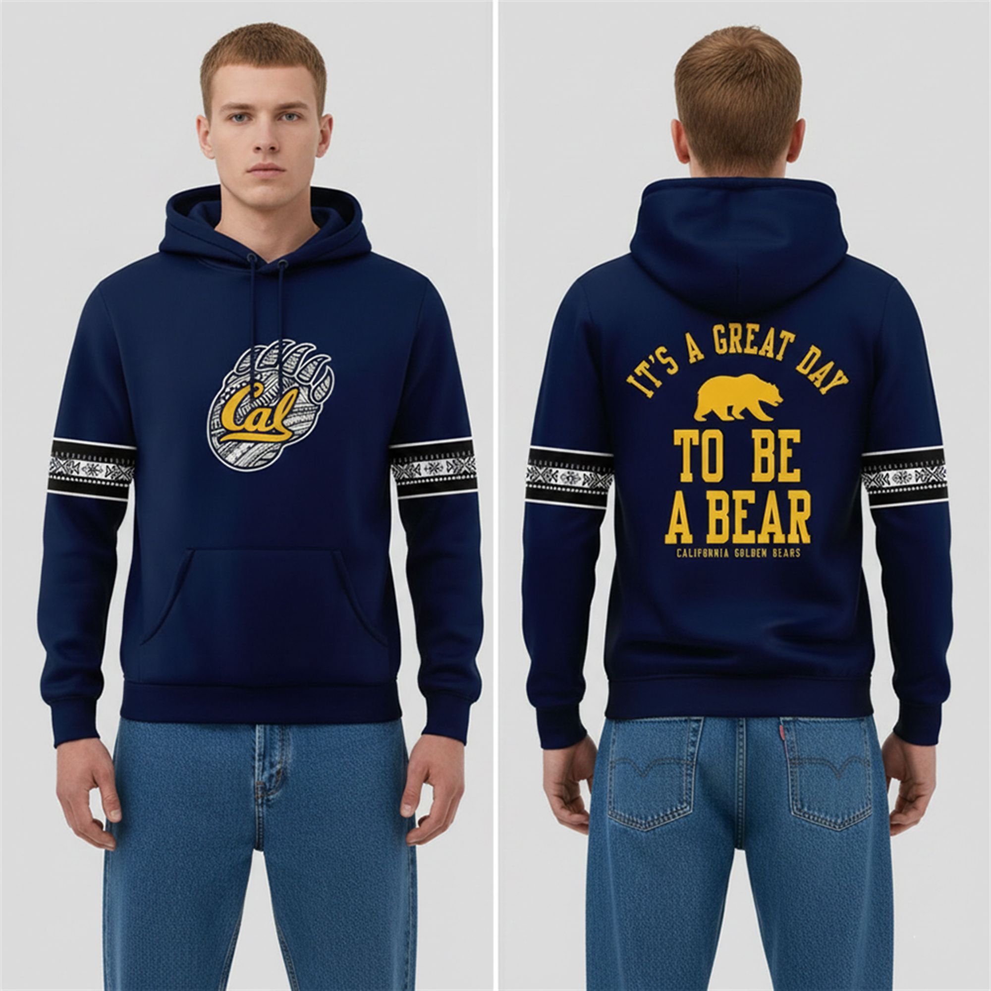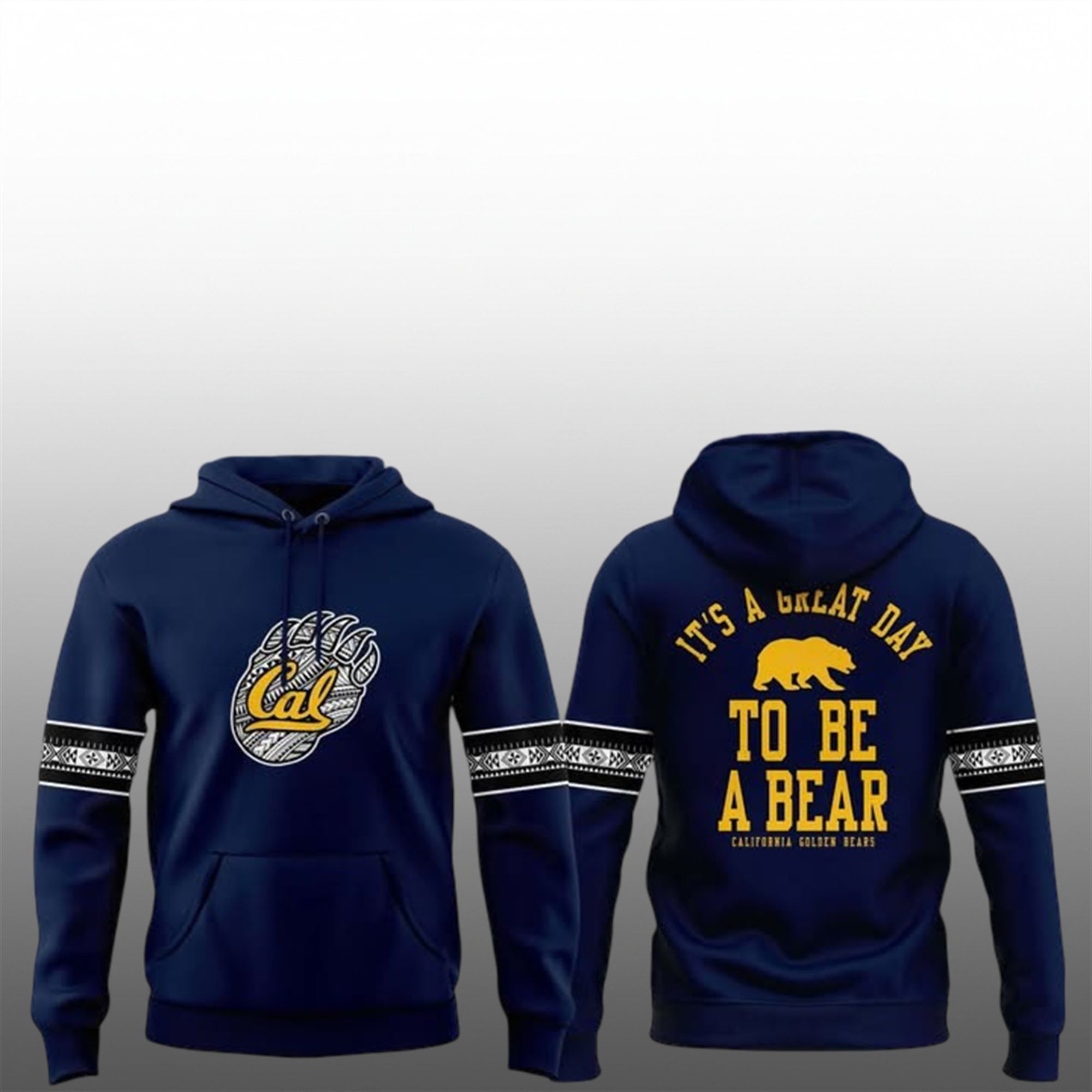 The sleeves feature coordinating geometric bands in white and black, adding a sporty, varsity-inspired touch that elevates the hoodie beyond standard fan gear. The back of the garment delivers the emotional punch every fan loves: the famous slogan “IT’S A GREAT DAY TO BE A BEAR” printed in bold, varsity-style lettering, anchored by a golden bear silhouette. It is a complete package of style, pride, and comfort.
