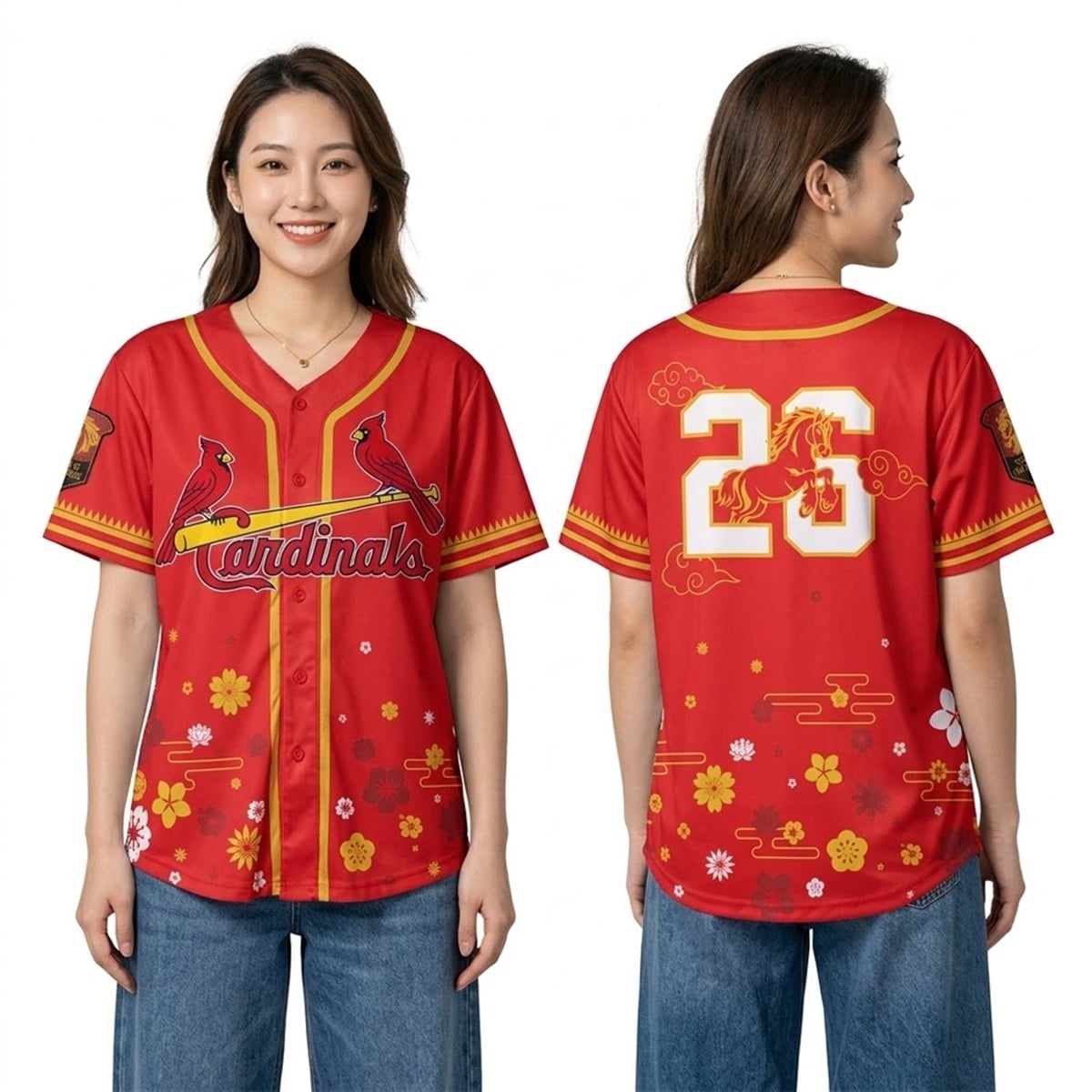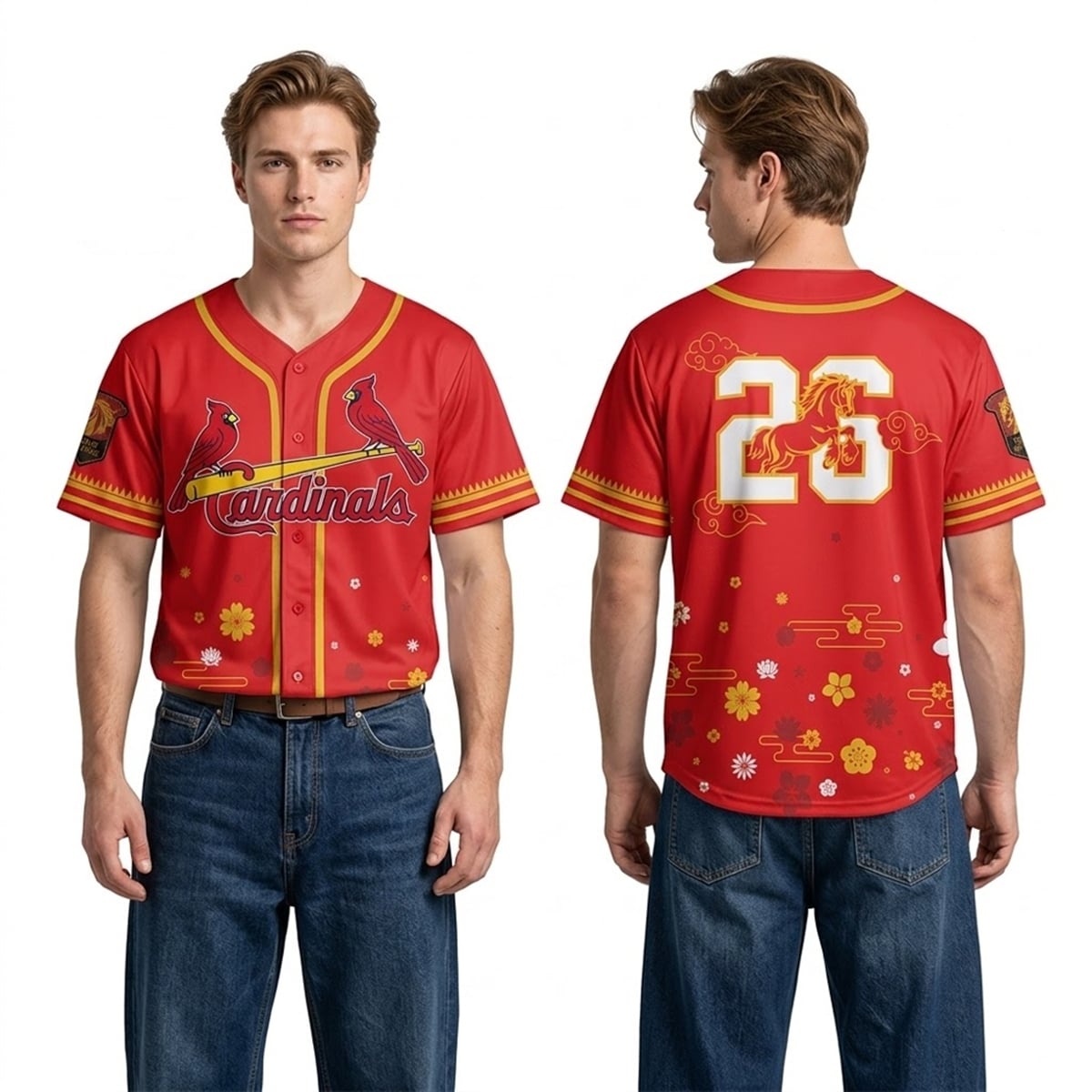 The jersey is a masterclass in visual integration, presenting a bold, red backdrop accented by striking yellow piping that nods to classic baseball aesthetics. Across the chest, the legendary Cardinals birds perched gracefully on a yellow bat remain the undeniable centerpiece. However, the true marvel of this piece lies in the surrounding artwork. The jersey is generously adorned with intricate traditional Asian cloud patterns, known as auspicious clouds, alongside a beautiful array of scattered floral graphics, including representations of cherry and plum blossoms. The back of the jersey prominently displays the number “26,” celebrating the year, with a magnificent, stylized galloping horse integrated into the digit, directly honoring the Chinese Zodiac Year of the Horse. A special commemorative patch graces the right sleeve, further cementing its status as an AAPI event release.
