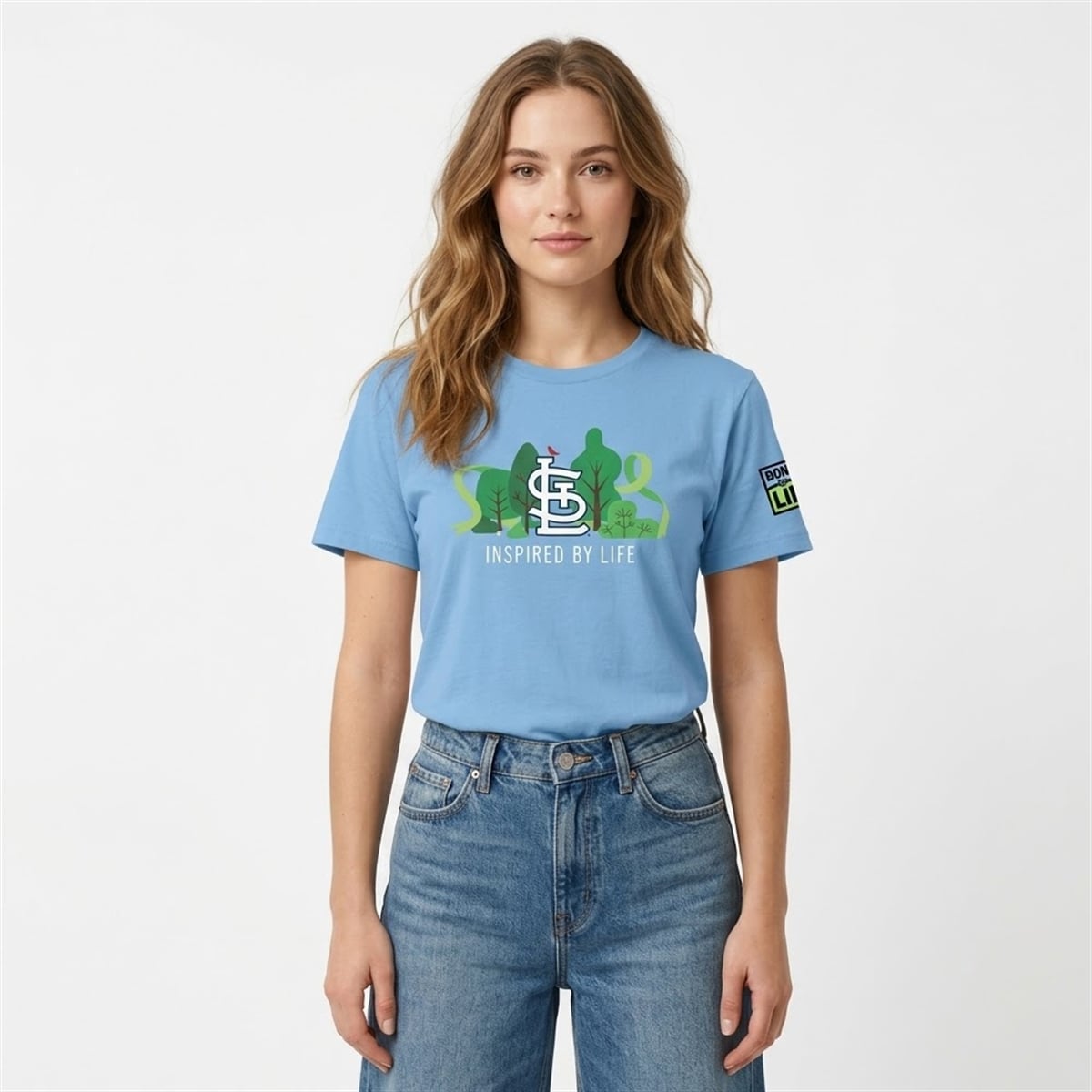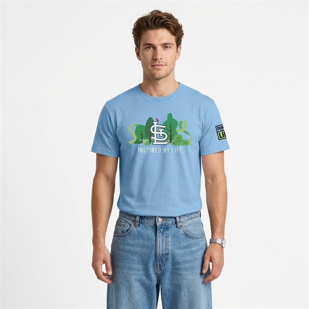 The shirt represents far more than standard team merchandise; it is a canvas for a critical public health message. Set against a calming light blue background, the central graphic is a beautifully illustrated nature scene. The iconic interlocking St. Louis Cardinals “StL” logo stands proudly amidst a grove of vibrant green trees, subtly accented by a sweeping green awareness ribbon. A tiny, symbolic red cardinal rests gently atop the logo, tying the natural imagery back to the home team.