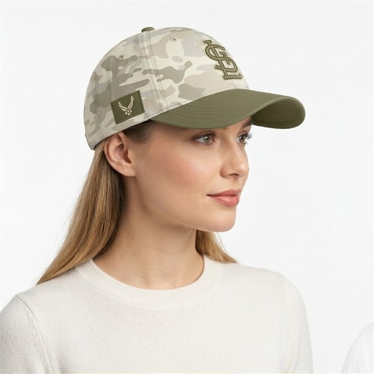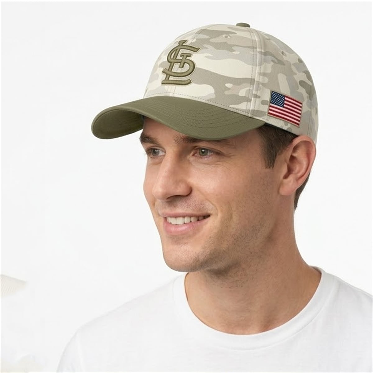 The hat is a visual triumph that reimagines the classic baseball cap through a patriotic lens. The crown of the hat features an intricate desert camouflage pattern in shades of cream, light tan, and subtle grey. Front and center sits the legendary interlocking St Louis Cardinals “StL” logo, rendered in a muted olive tone that perfectly matches the solid-colored bill.