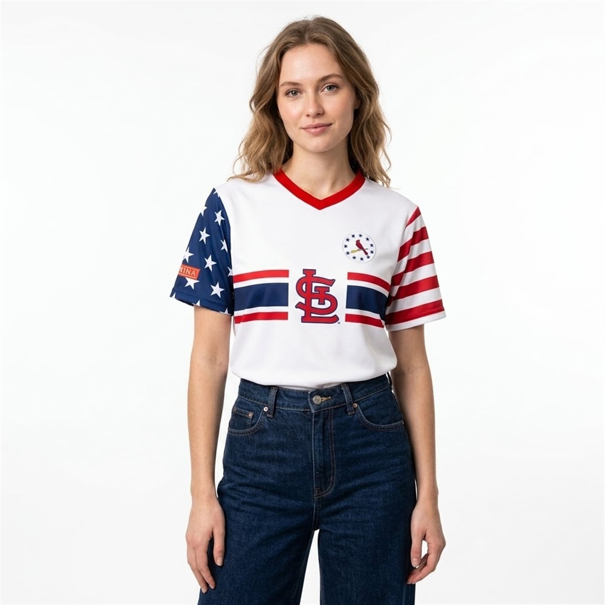 The jersey is a bold departure from traditional promotional apparel. This year’s design features a crisp white base accented by a patriotic color palette of deep cardinal red and navy blue. The right sleeve is adorned with a stunning star pattern on a blue field, while the left sleeve sports iconic red and white stripes—a nod to the classic “Americana” style that resonates during the summer months at Busch Stadium.