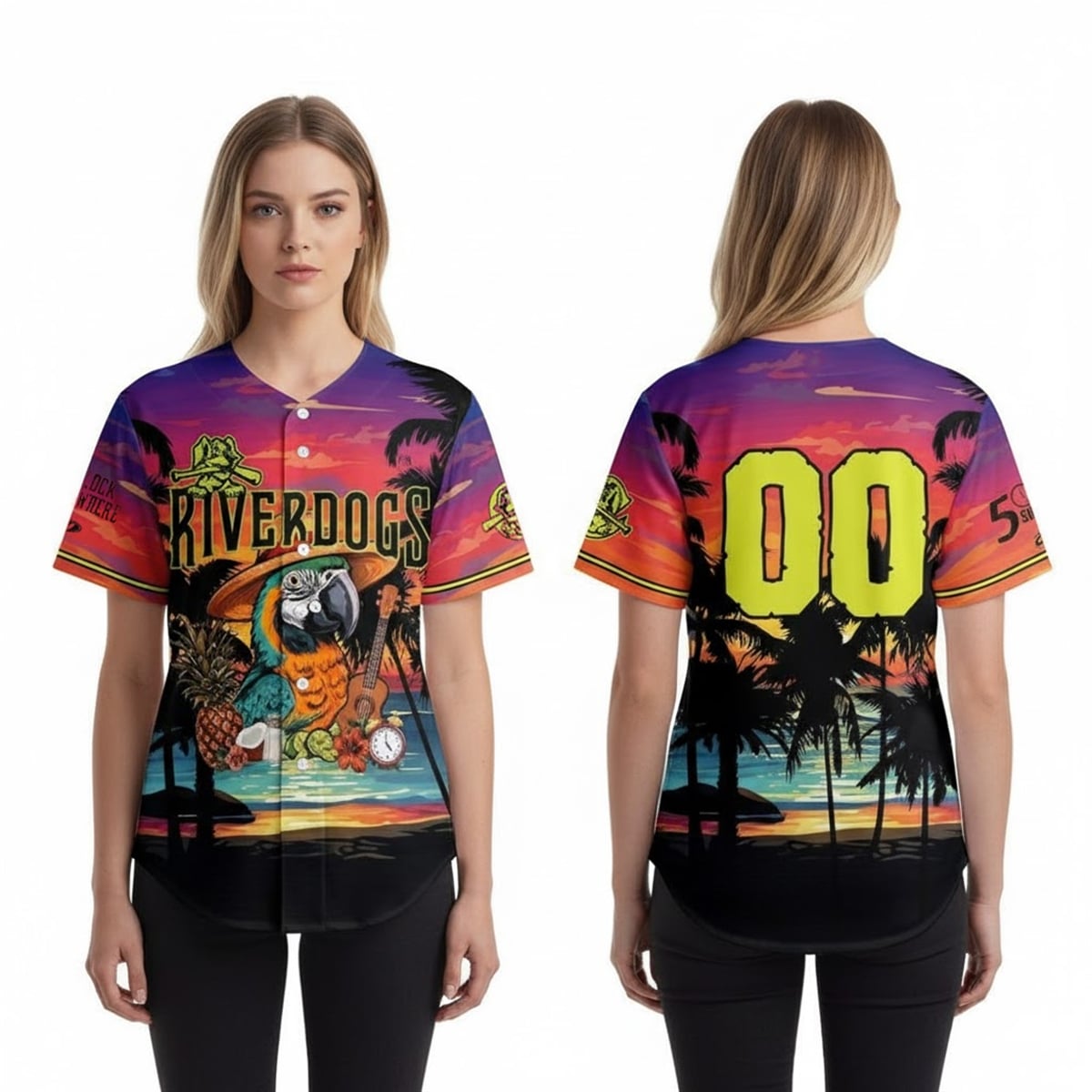 The jersey is a masterful visual celebration of theme-night sports apparel. Visually anchored by a breathtaking gradient of deep purples, fiery oranges, and golden yellows, the design mimics a perfect tropical sunset over the water. The front features the classic “RIVERDOGS” wordmark integrated seamlessly with a large, charismatic parrot wearing a sombrero. Flanking this tropical mascot are iconic island motifs: a perfectly detailed pineapple, a sliced coconut, an acoustic guitar, and a clock frozen at five o’clock. The back of the jersey showcases a bold, lime-green “00” number set against silhouetted palm trees reflecting on calm ocean waters. The sleeve proudly displays the famous “5 O’Clock Somewhere” emblem, making it a true collector’s item for fans of themed sports apparel.