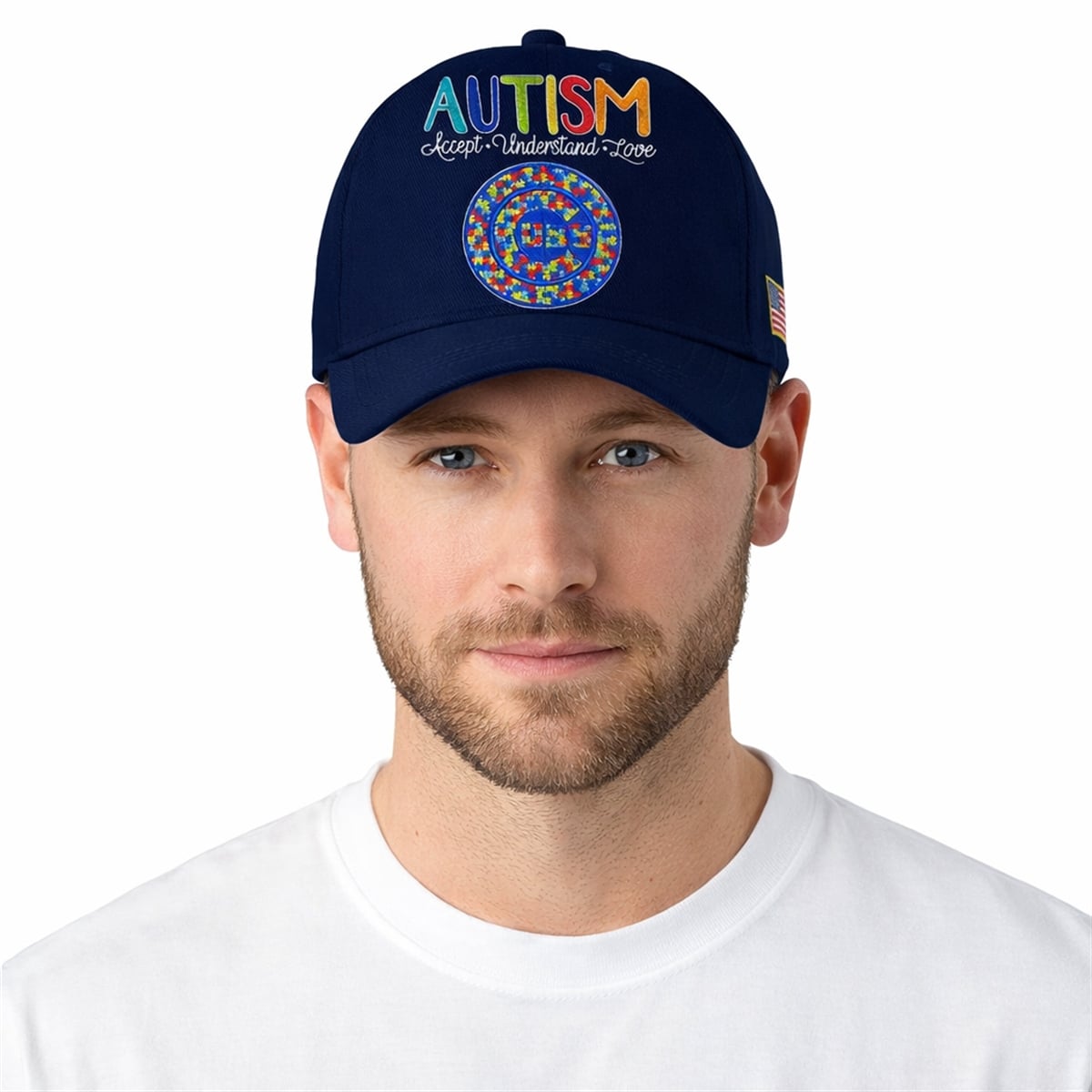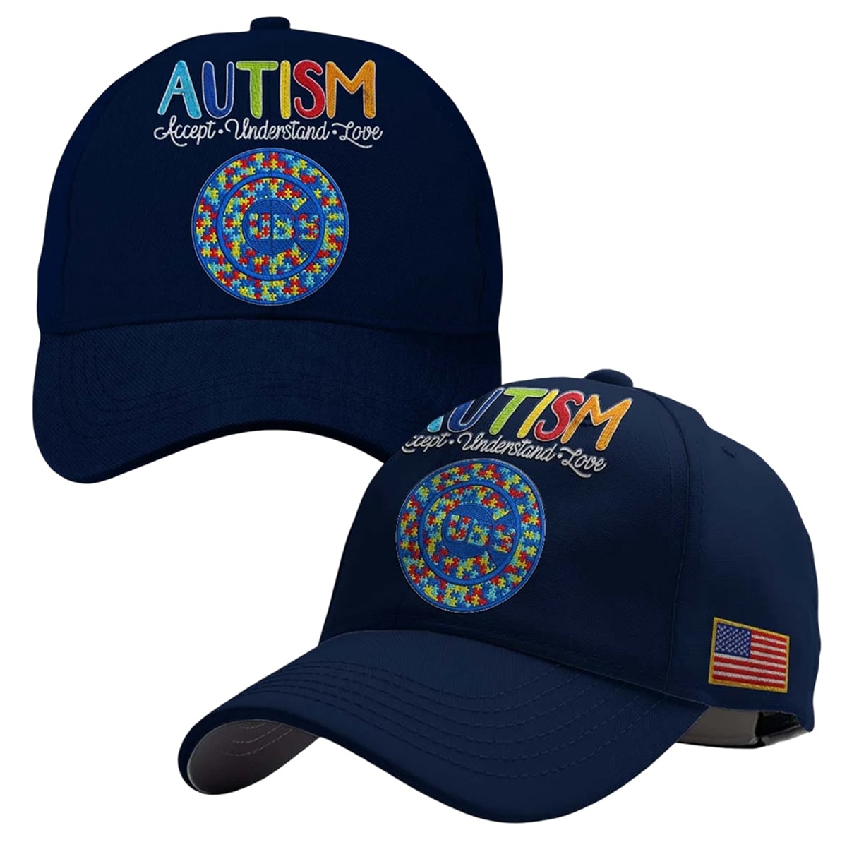 The hat is a visually striking tribute to both baseball fandom and neurodiversity advocacy. Set against a classic navy blue background, the front of the cap features the word “AUTISM” prominently displayed in vibrant, multicolored lettering. Directly beneath, the cursive phrase “Accept • Understand • Love” anchors the design’s core philosophy. The centerpiece is the legendary Chicago Cubs “C” logo, entirely reimagined and filled with interlocking, multicolored puzzle pieces. To complete the design, a classic United States flag patch is featured on the side panel, adding a touch of national pride to this powerful statement piece.