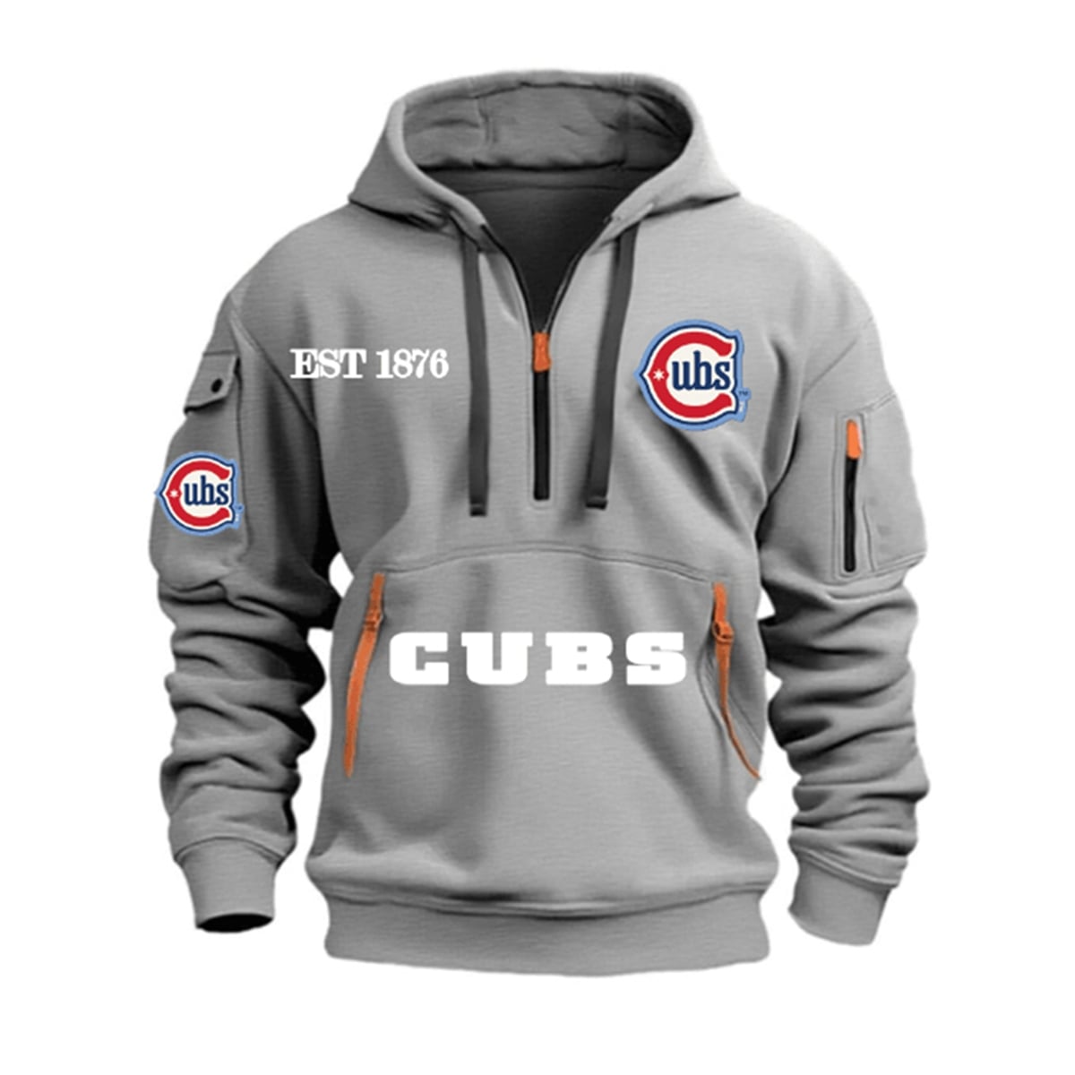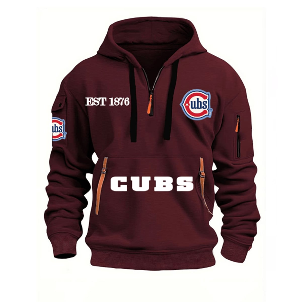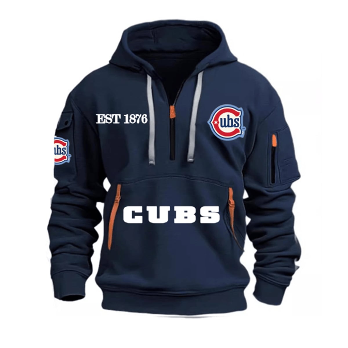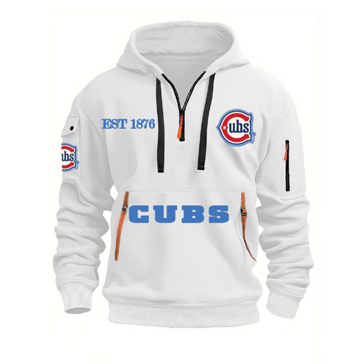 The hoodie reimagines standard sports apparel by introducing tactical, utility-focused design elements into a classic fan silhouette. Bathed in the team’s signature vibrant blue, this hoodie commands attention. The front features a bold “CUBS” wordmark across the expansive lower pouch, complemented by the iconic “C” logo on the left chest and a proud “EST 1876” on the right. Unique to this 2026 edition are the specialized utility features, including contrasting brown zipper pulls on the main quarter-zip closure, dual front pocket zippers, and an innovative zippered sleeve pocket perfect for securing small essentials on the go. Thick black drawstrings frame the hood, adding a sharp, modern contrast to the overall aesthetic.