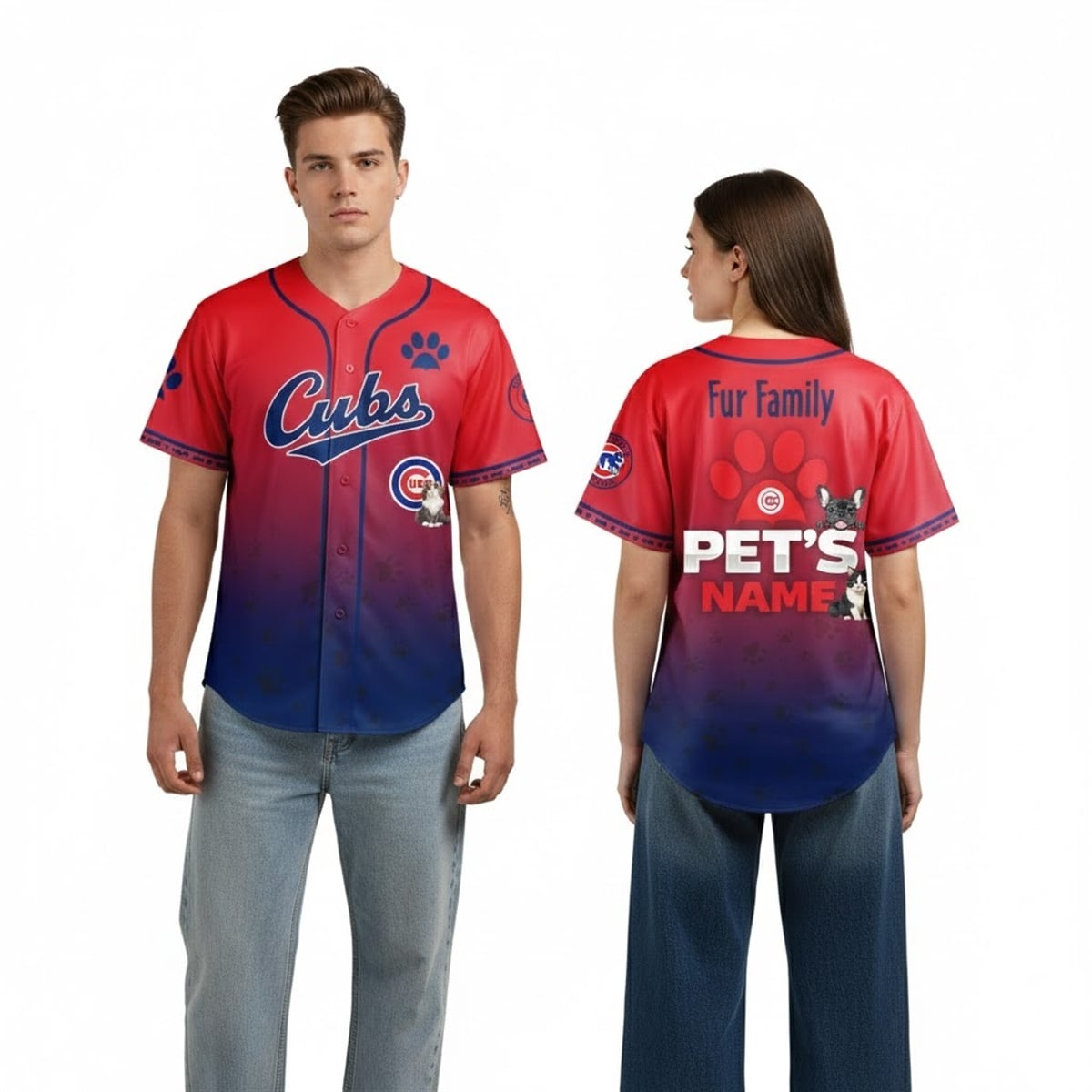 The design features a bold red-to-blue gradient inspired by the Cubs’ iconic colors. On the front, the classic “Cubs” script stands prominently across the chest, accompanied by playful paw-print graphics that instantly communicate the pet-friendly theme. Small illustrated pets near the lower section add charm and personality, reinforcing the idea that game night is a shared experience between fans and their beloved animals.