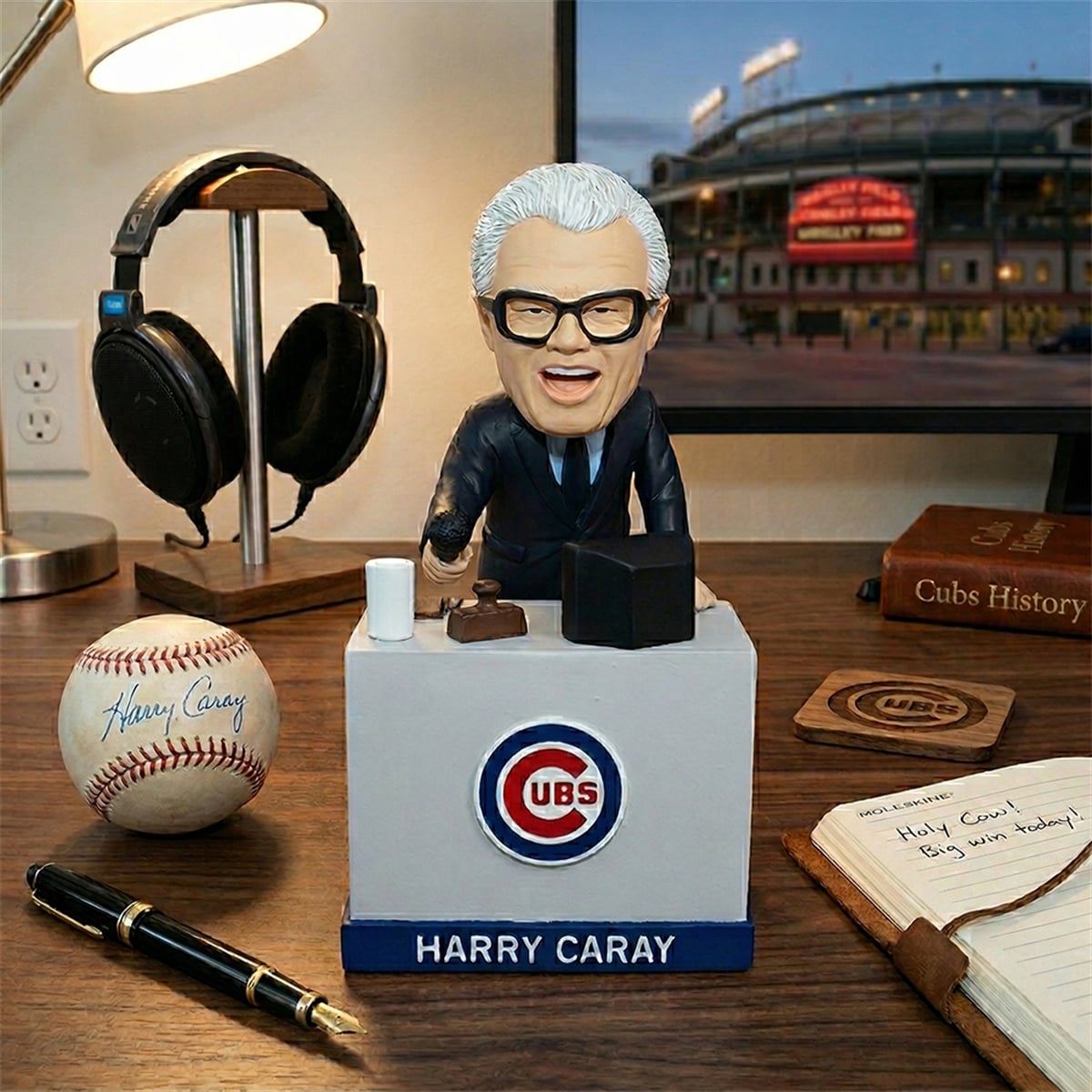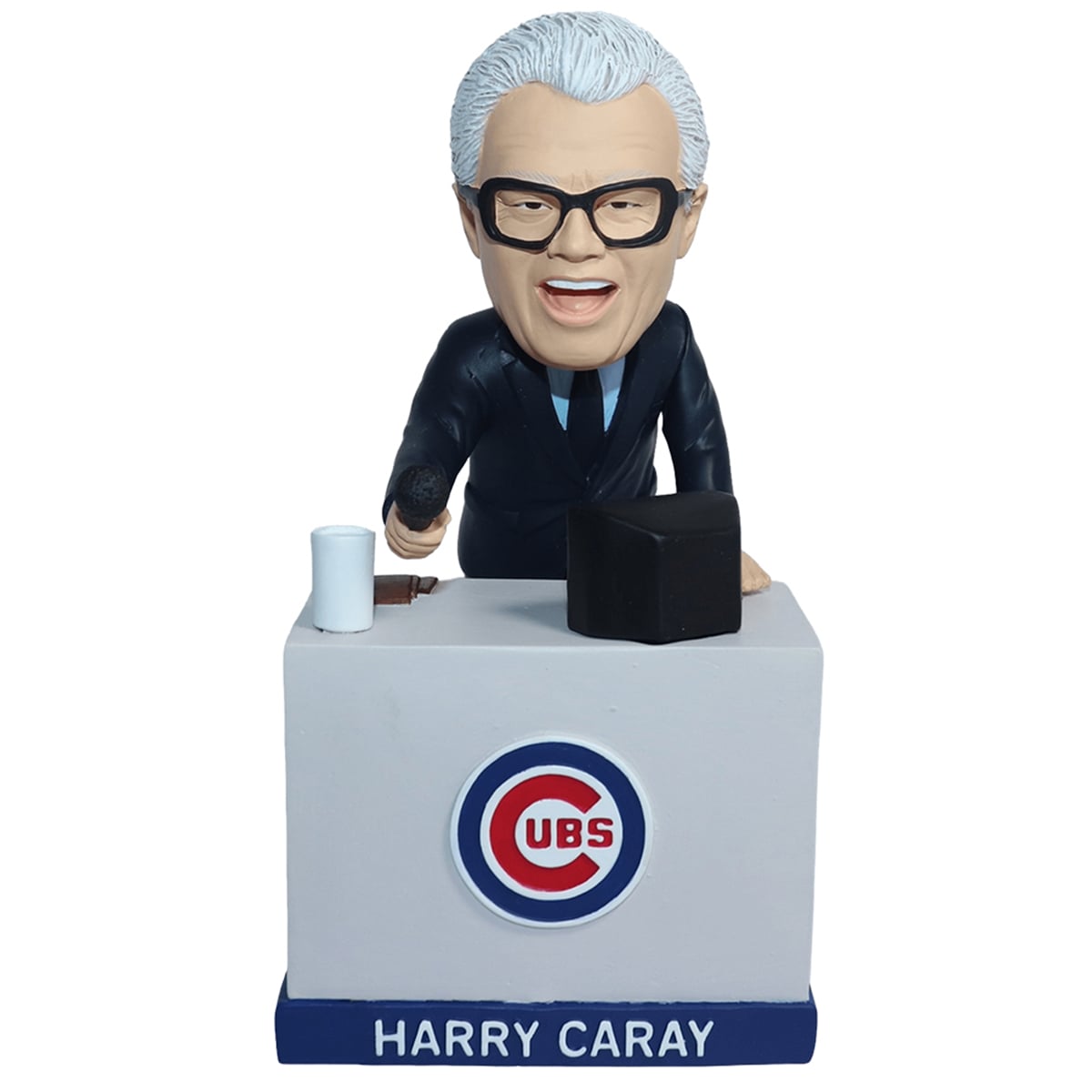 The bobblehead presents a dynamic, diorama-style design that goes beyond the traditional single-figure format. The piece features the beloved broadcaster leaning intently over his broadcasting desk, deeply engaged in calling a thrilling game. He is sporting his signature slicked-back white hair, sharp suit, and the unmistakably bold, thick-rimmed black glasses that became his trademark. In his right hand, he holds a classic stadium microphone, ready to exclaim his famous “Holy Cow!” catchphrase. The desk itself features a prominent, vibrant Chicago Cubs bullseye logo on the front, while the sturdy base clearly displays “HARRY CARAY” in bold, capitalized lettering. A small replica coffee cup rests on the desk, adding a touch of everyday realism to this legendary broadcast setup.