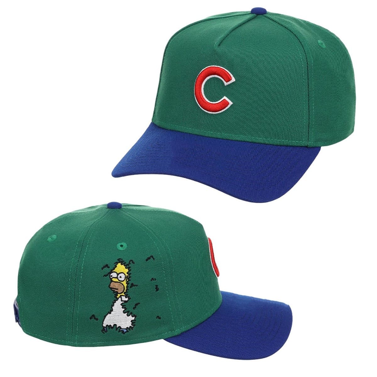 The hat is a masterclass in pop-culture synergy. The design prominently features a vibrant green crown, instantly evoking the legendary, lush greenery that lines the outfield walls of the team’s historic home stadium. A contrasting blue brim perfectly frames the face while paying homage to the team’s traditional color palette. Front and center sits the classic, unmistakable red Chicago Cubs “C” logo, ensuring your team allegiance is proudly displayed. However, the true showstopper is located on the side panel: a flawless embroidered recreation of Homer Simpson famously disappearing into the bushes. This visually striking juxtaposition creates a fun, lighthearted, and undeniably unique aesthetic that stands out in any crowd.