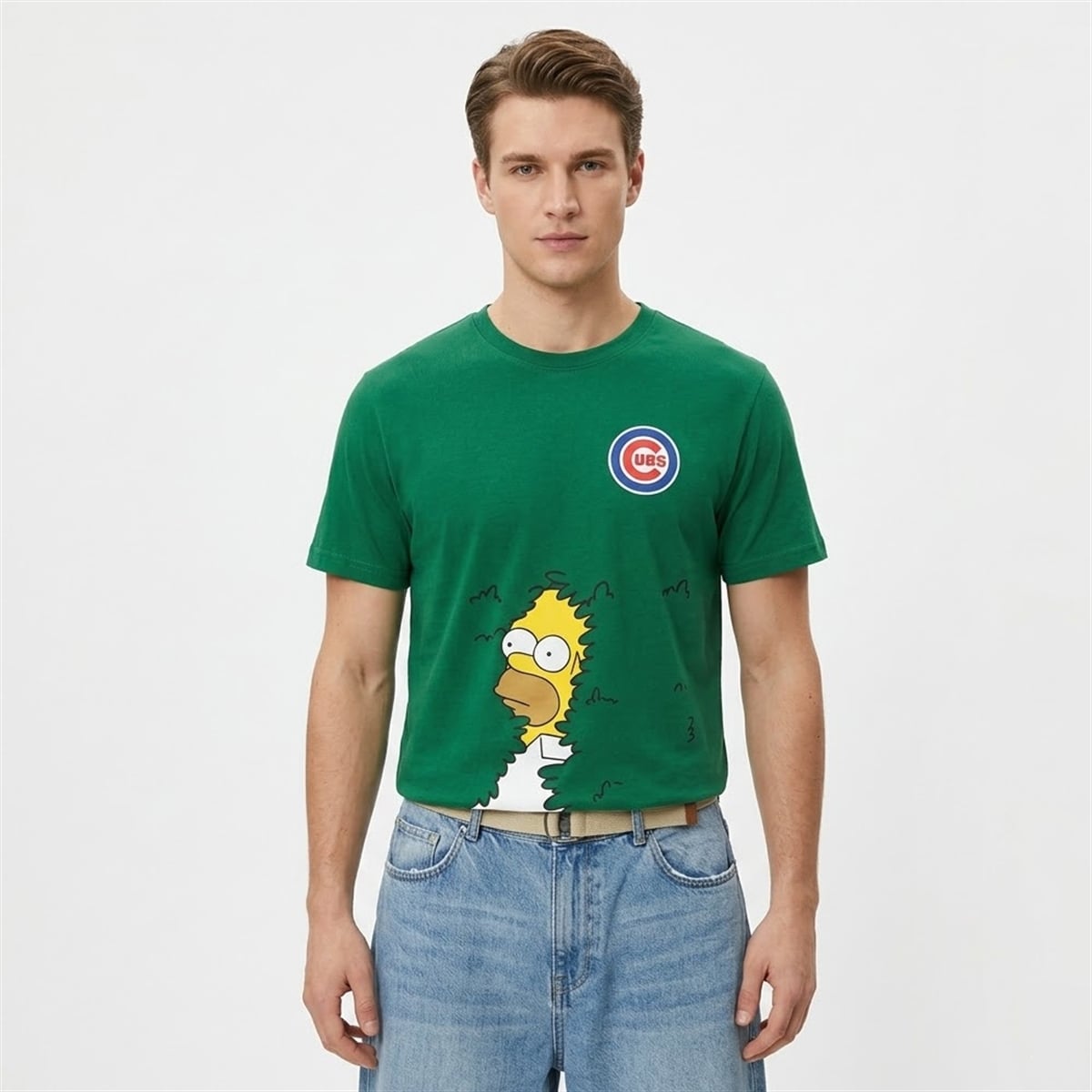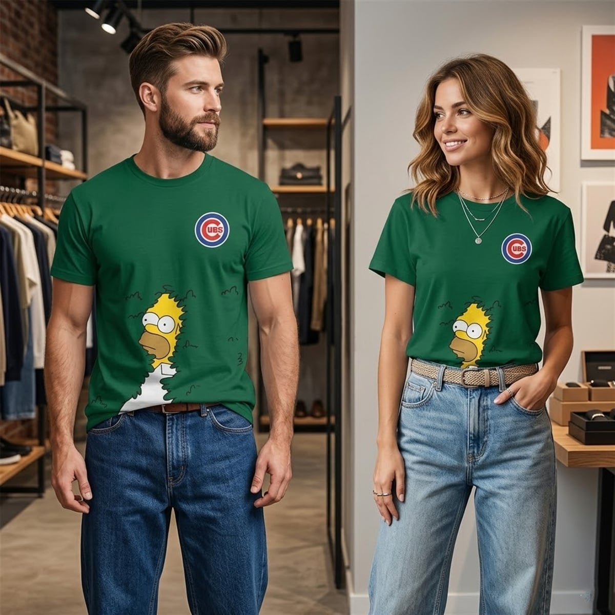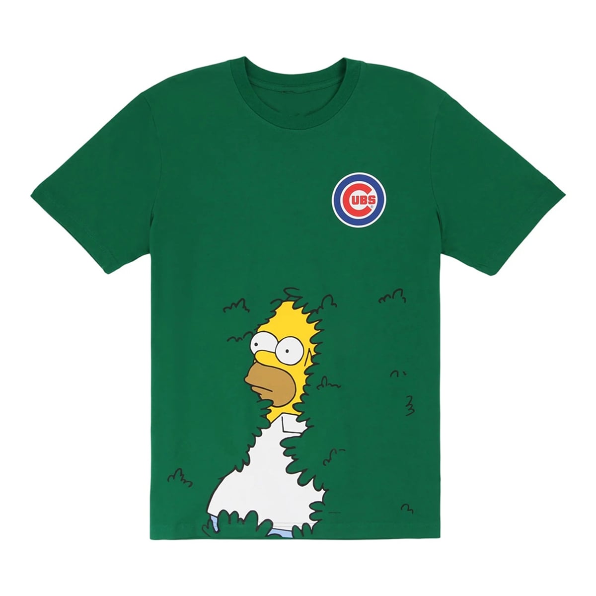 The shirt is a triumph of pop-culture fusion, designed for the modern era of sports fandom. The garment utilizes a deep, rich green base color that acts as a visual extension of the historic Wrigley Field outfield. On the upper left chest, the traditional Chicago Cubs roundel logo is prominently displayed, grounding the piece in team pride. However, the true centerpiece occupies the lower half of the torso: a large, accurately rendered graphic of Homer Simpson performing his infamous, slow retreat into the brush. In this clever adaptation, the iconic cartoon character is not just disappearing into any generic hedge; he is becoming one with the legendary Chicago ivy. This visual synergy transforms a standard piece of sports merchandise into a highly relevant, highly sought-after piece of contemporary digital folklore.