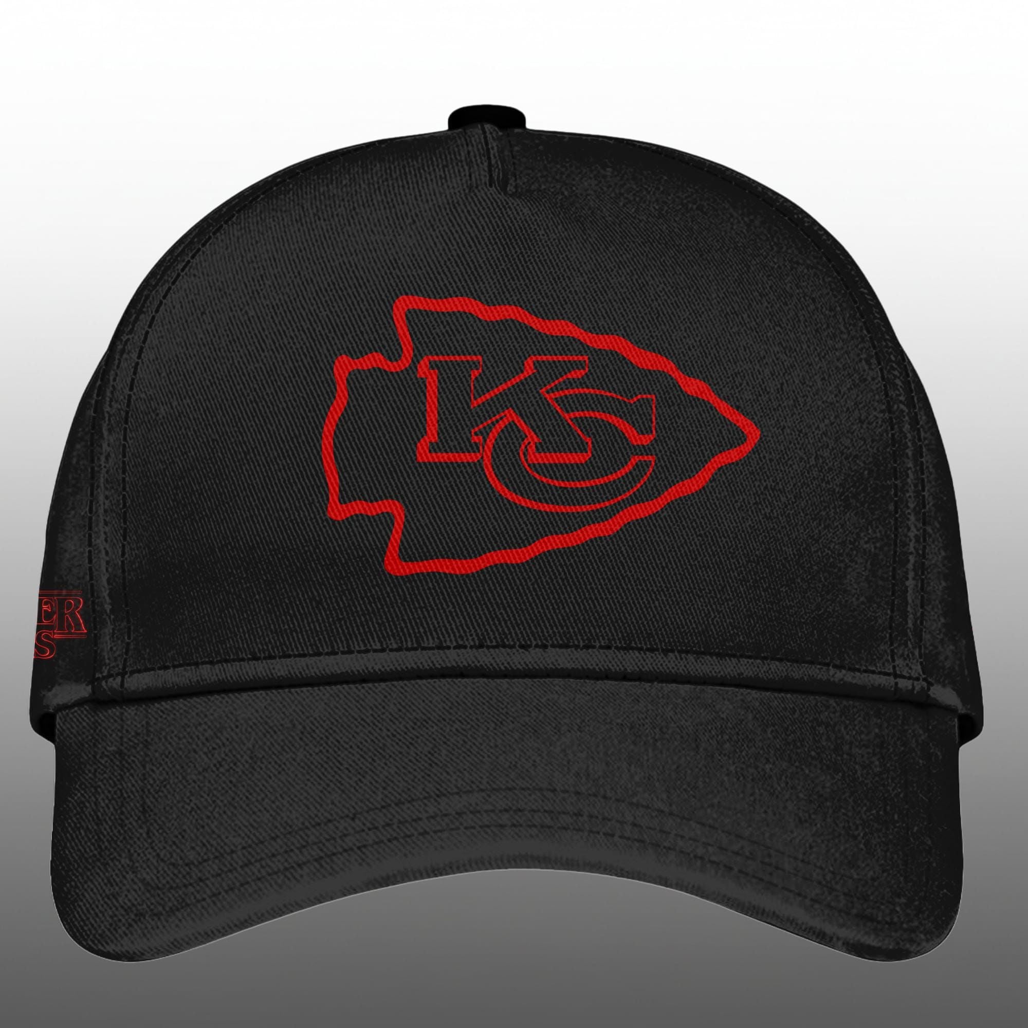 The design utilizes a high-contrast black base, allowing the vibrant, neon-red graphics to pop. The front boldly features CHIEFS text paired with the classic Kansas City Arrowhead logo, echoing the eerie, stylized font from the Stranger Things title. The reverse side delivers the full crossover impact: the style STRANGER THINGS logo, modified to read “STRANGER THINGS 5” to celebrate the new season, hovering above a large, menacing Kansas City Chiefs Arrowhead graphic. This dual-fandom tribute is artfully executed, making it a unique collector’s item and a conversation starter.