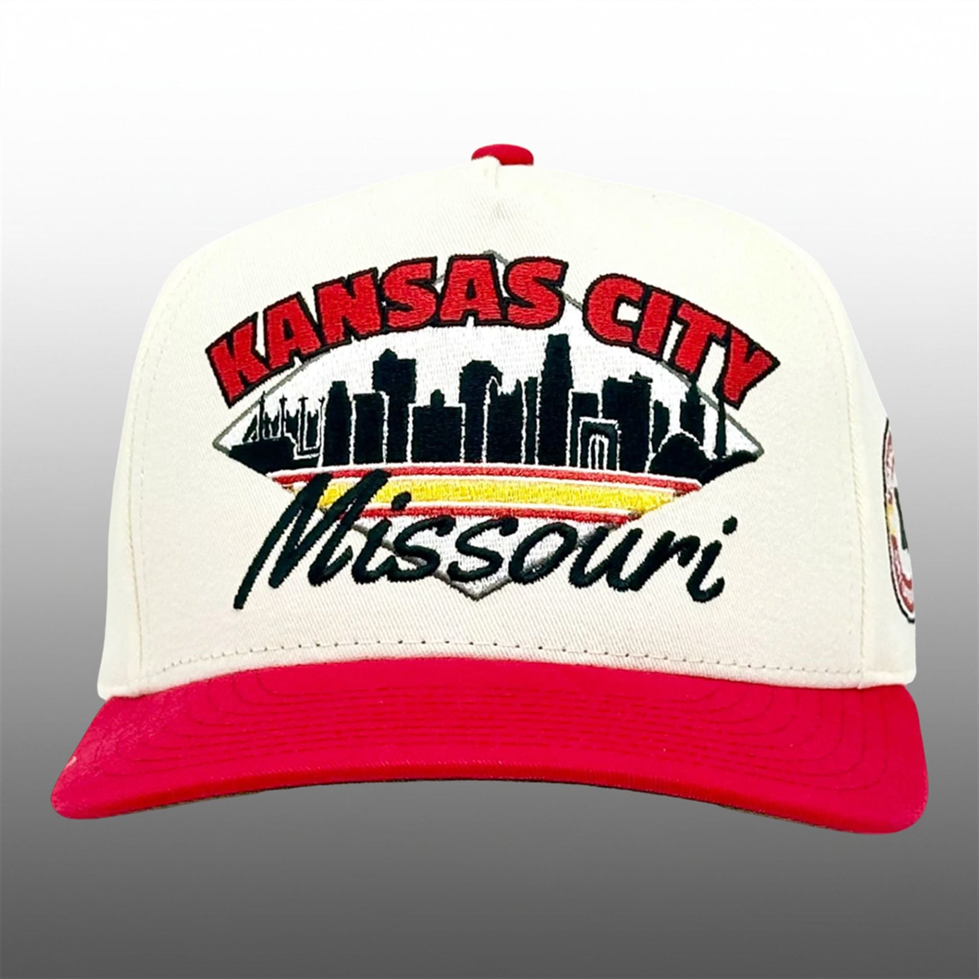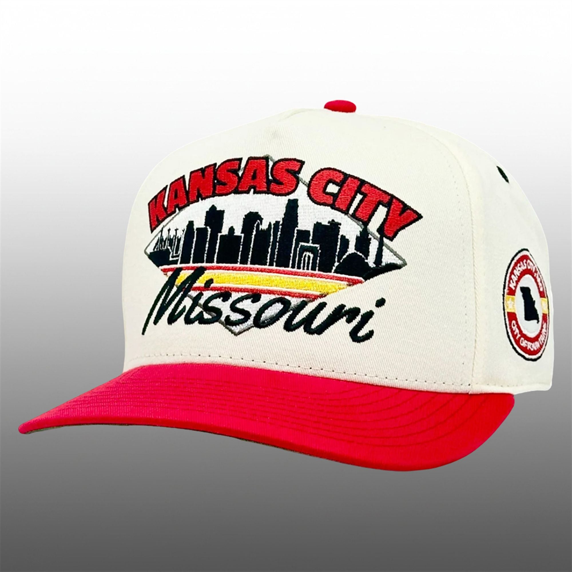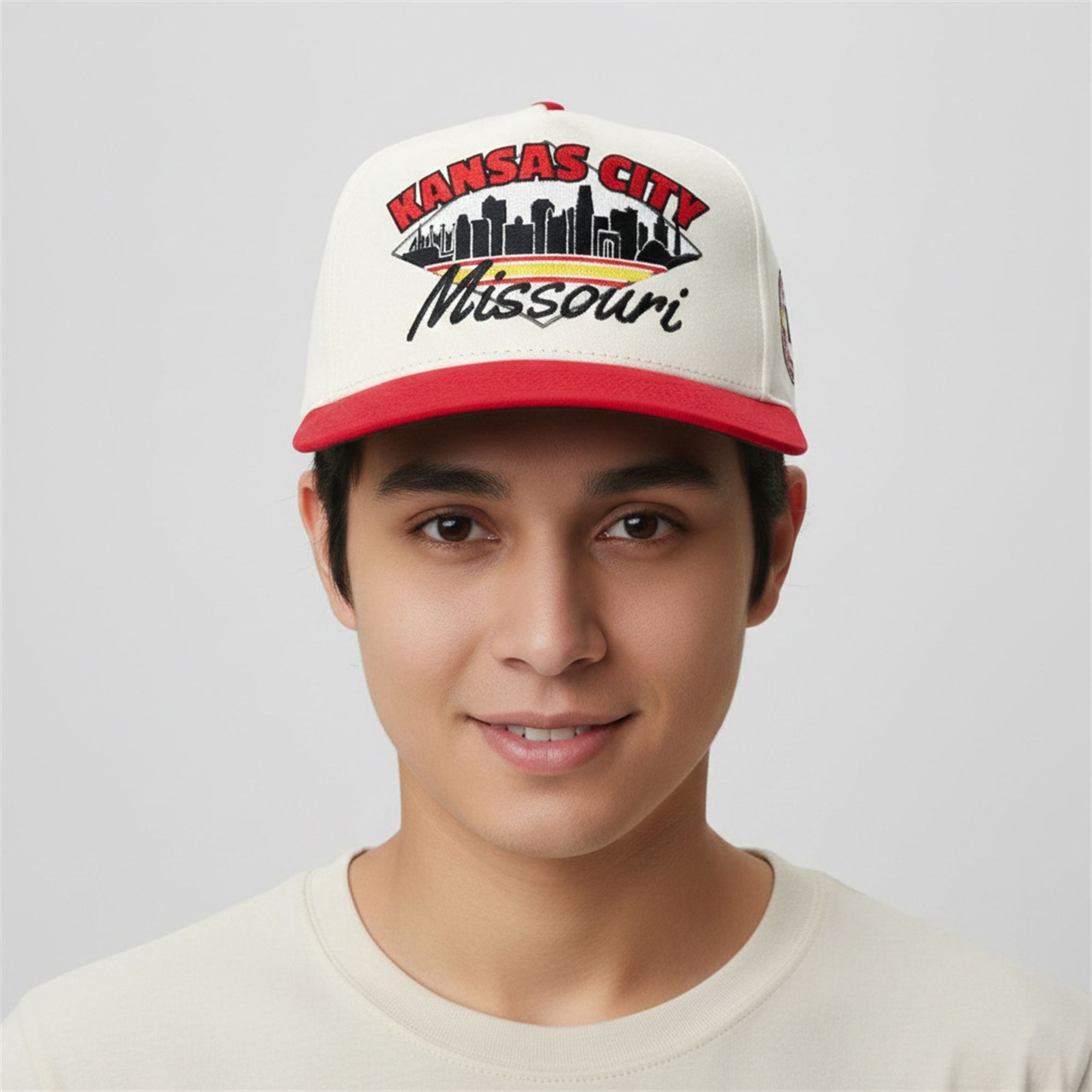 The centerpiece of the cap is the intricate. It showcases a stylized Kansas City skyline silhouette nestled within a retro diamond graphic. Above the skyline, “KANSAS CITY” is arched in bold, collegiate-style red lettering, while “Missouri” is scripted elegantly below in black, creating a dynamic visual contrast. The side profile features a distinctive circular patch (as seen in the viral images), adding an extra layer of authenticity.