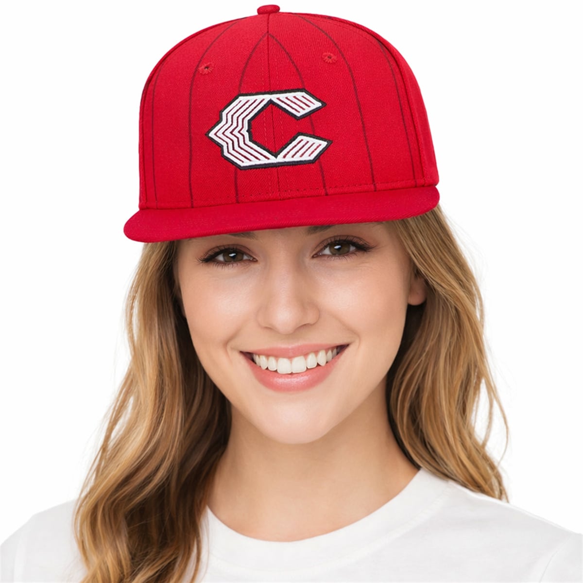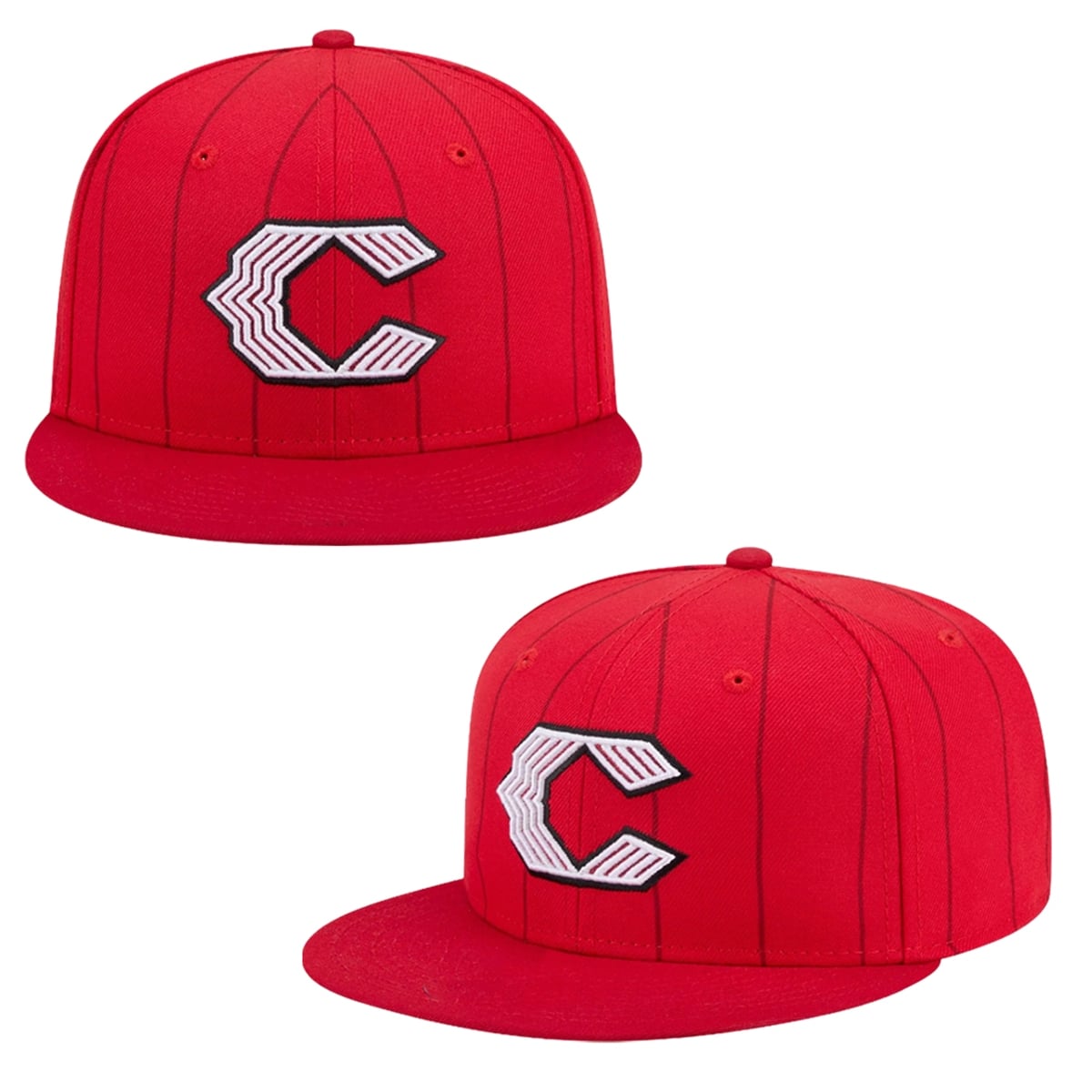The hat is a visual triumph that perfectly captures the bold energy of modern baseball culture. Visually, the piece is anchored by a vibrant, saturated red foundation that commands immediate attention. Running vertically across the panels are subtle, darker red pinstripes, creating a mesmerizing tone-on-tone visual depth that looks spectacular under stadium lights. The undeniable centerpiece is the reinvented Cincinnati Reds ‘C‘ logo on the front crown. Outlined in stark black and filled with sharp, geometric white and red chevron patterns, the crest looks fast, aggressive, and undeniably modern. This cap abandons traditional restraint, offering a highly stylized, fashion-forward approach to team representation that effortlessly bridges the gap between stadium apparel and urban streetwear.