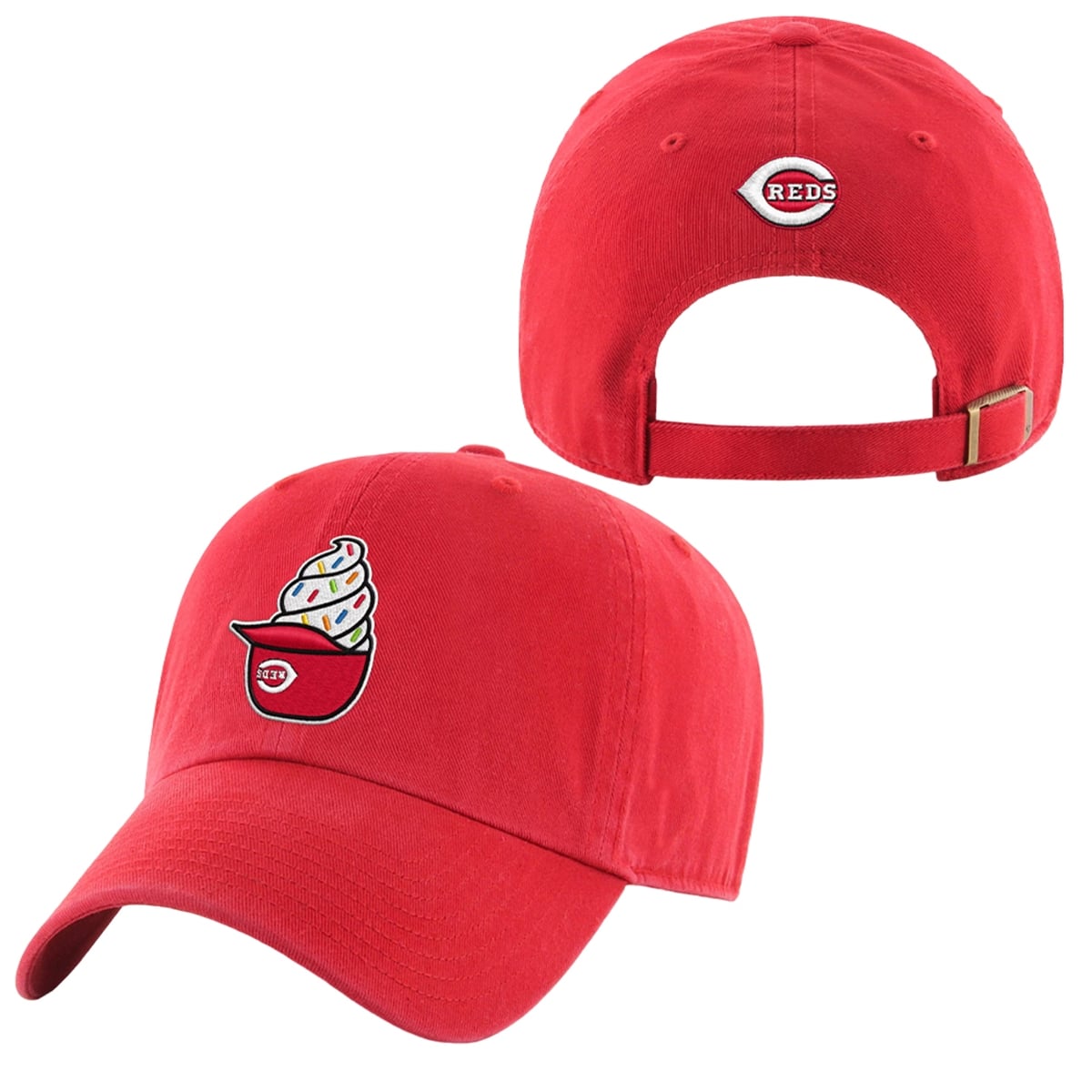 The hat is a vibrant, revolutionary take on traditional sports apparel. Moving away from standard primary Cincinnati Reds logos, this piece introduces a brilliant visual motif: a miniature, iconic red batting helmet serving as a bowl, overflowing with soft-serve ice cream and topped with colorful sprinkles. Set against a striking, bold red background, the cap acts as a brilliant pop of color that instantly draws the eye. It is a bold departure from conventional merchandise, designed specifically for the modern fan who views team apparel as an extension of their personal fashion identity rather than just a simple uniform.