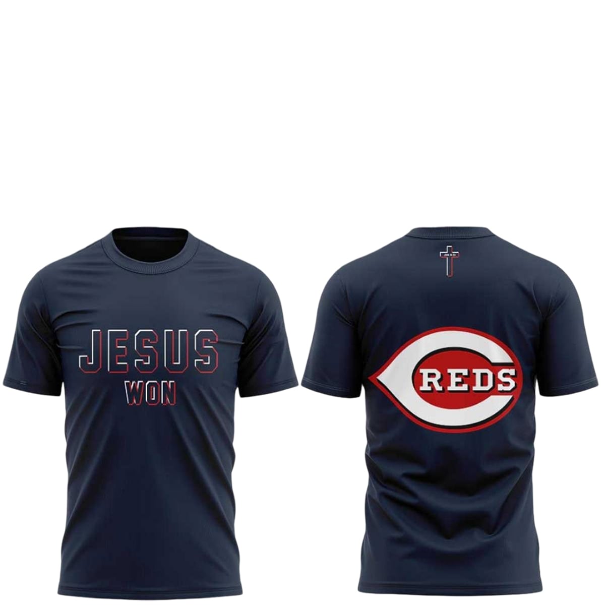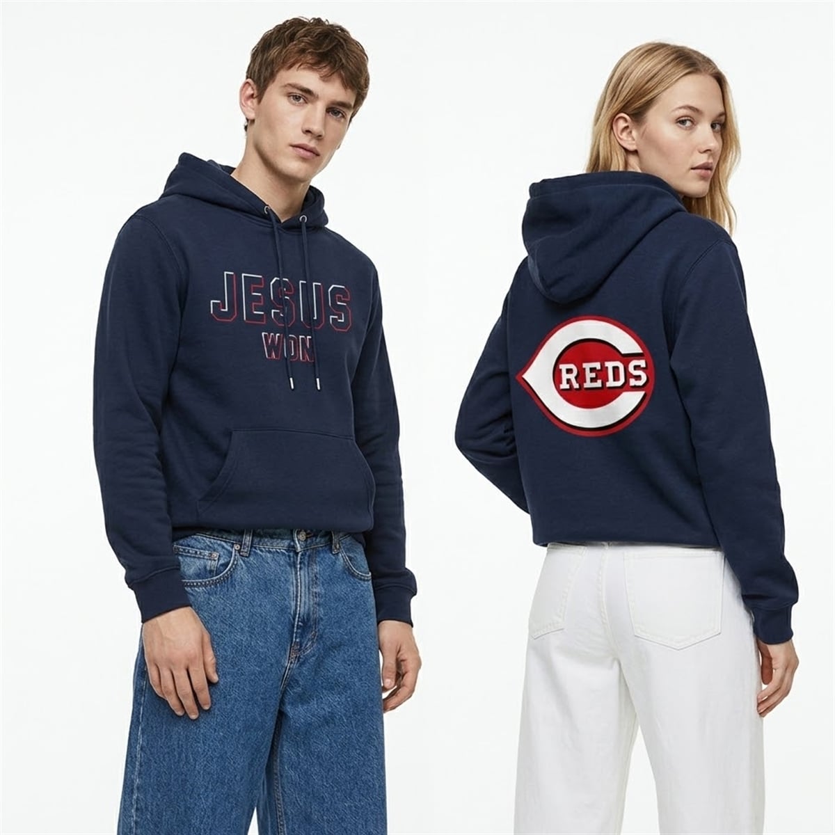 The visual architecture of the hoodie is designed for maximum impact and clear messaging. The garment utilizes a deep, solid navy blue base, providing a stark and visually appealing contrast to the vibrant team colors. On the front, the phrase “JESUS WON” is displayed prominently across the chest in a dynamic, shadowed typeface that incorporates subtle red and white accents, mirroring the aesthetic of professional sports lettering. The back of the garment is anchored by the iconic, classic Cincinnati Reds ‘C‘ logo, instantly recognizable to any baseball aficionado. This strategic layout ensures that the wearer’s spiritual message leads the way, while their team allegiance provides a powerful backing.
