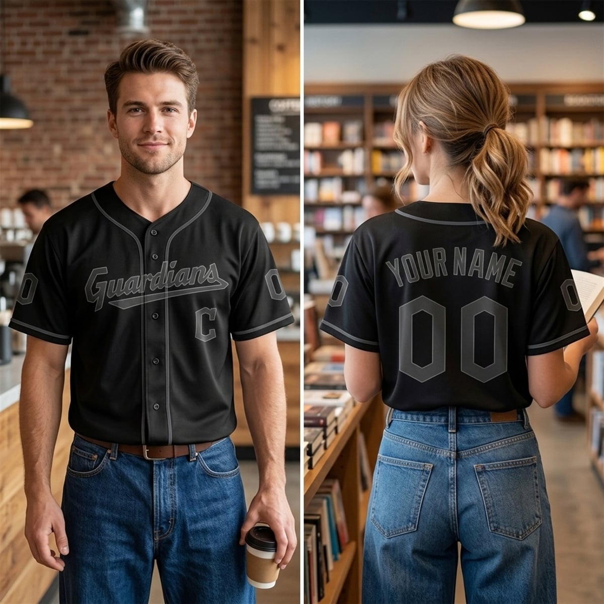 The jersey is a visual triumph in contemporary sports fashion. The design features a deep, pitch-black base adorned with charcoal and slate-grey lettering, creating a striking black-on-black contrast. Across the chest, the iconic “Guardians” script is proudly displayed alongside the signature “C” logo, both treated with a subtle, shadowy finish. Turn it around, and the true magic happens: the back is completely customizable, allowing you to immortalize your own name and favorite digits in the matching blackout font. It is a seamless blend of athletic tradition and modern, edgy streetwear.