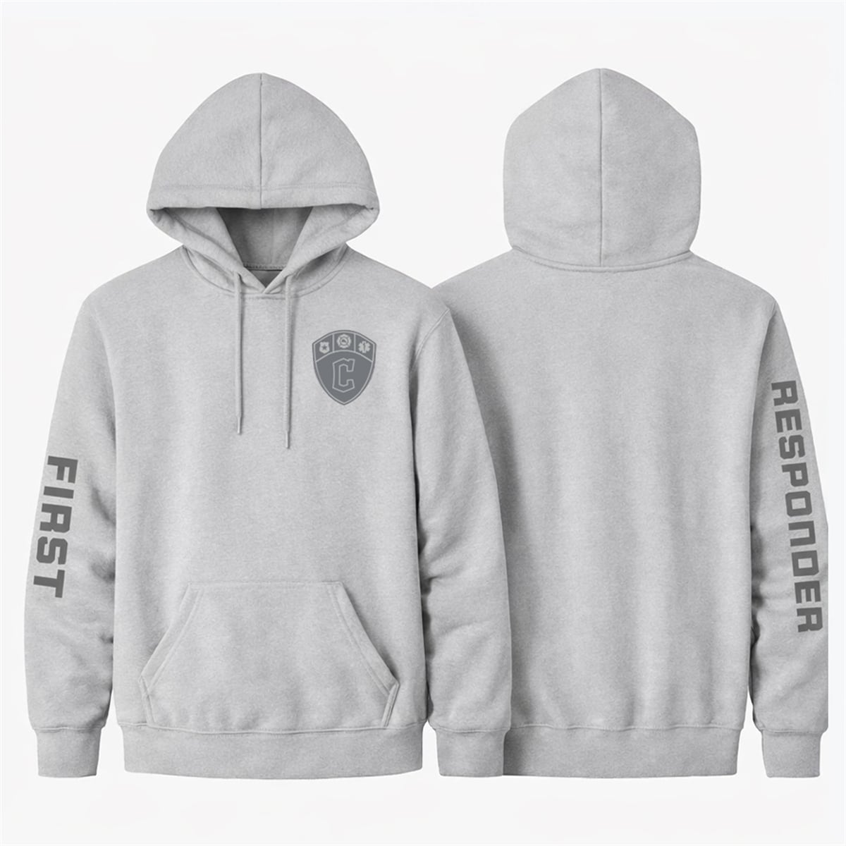 This hoodie features a clean, light grey aesthetic that serves as a perfect canvas for its profound charcoal-grey graphics. The right sleeve prominently displays the word “FIRST”, while the left sleeve completes the phrase with “RESPONDER”, ensuring the message is highly visible from any profile angle. The centerpiece of the design rests on the left chest: a custom-designed shield badge. This unique crest cleverly houses the iconic Cleveland Guardians “C” surrounded by universally recognized symbols representing police, fire, and emergency medical services. The minimalist color palette ensures the focus remains entirely on the message and the unified symbols of the city.