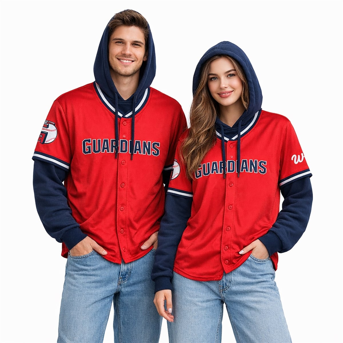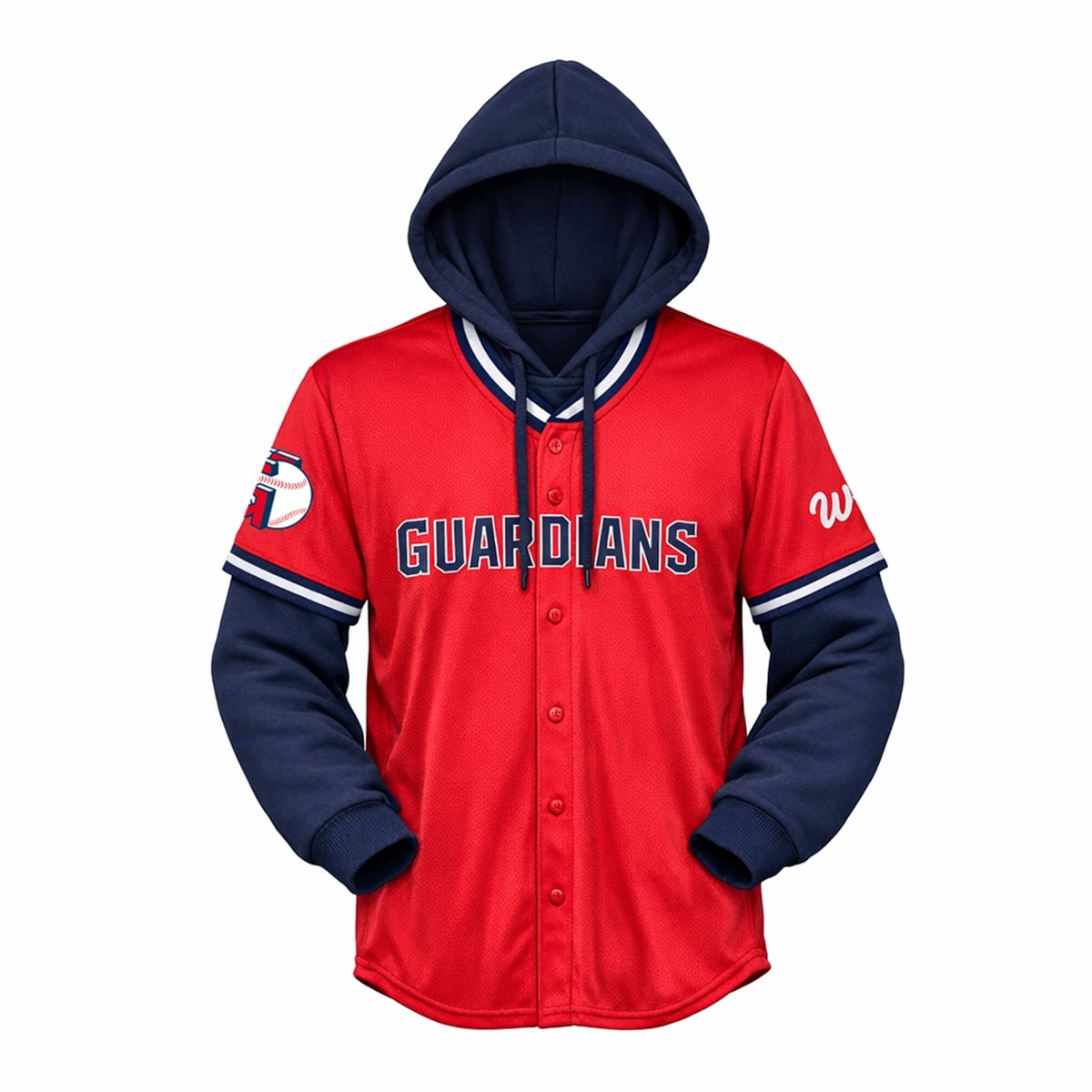 The jersey hoodie is a masterclass in modern sports styling. Visually, it presents the illusion of wearing a bright red, button-up Guardians jersey layered perfectly over a long-sleeve navy blue hoodie, complete with a matching navy hood and drawstring details. The striking “GUARDIANS” text is prominently displayed across the front, complemented by distinct sleeve graphics, including a stylized baseball logo and a secondary ‘W‘ emblem.