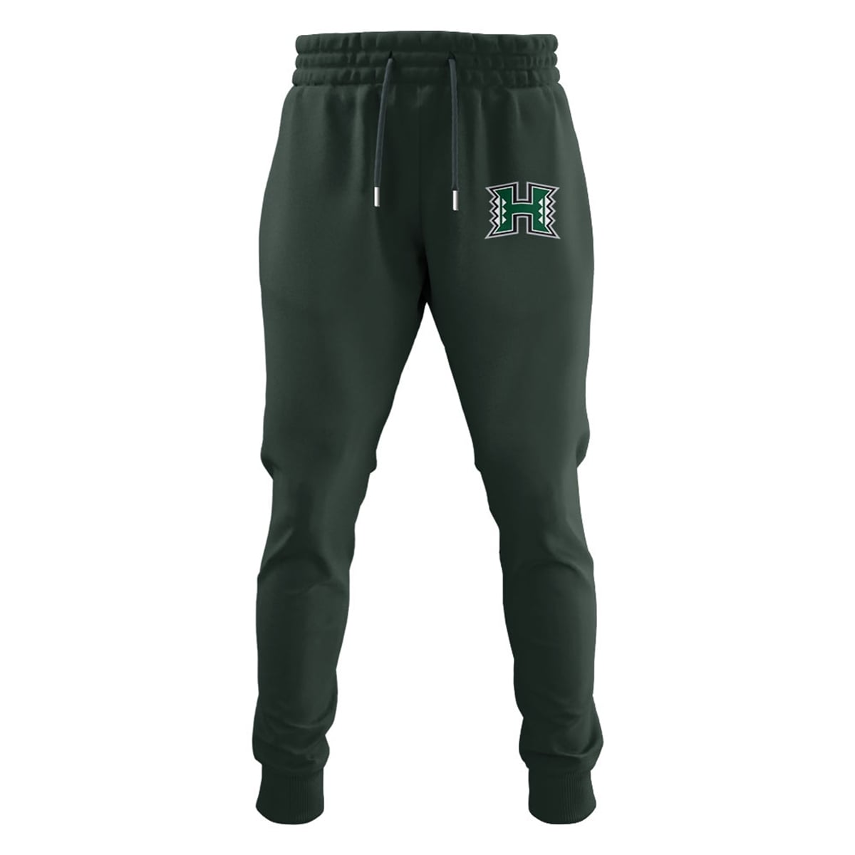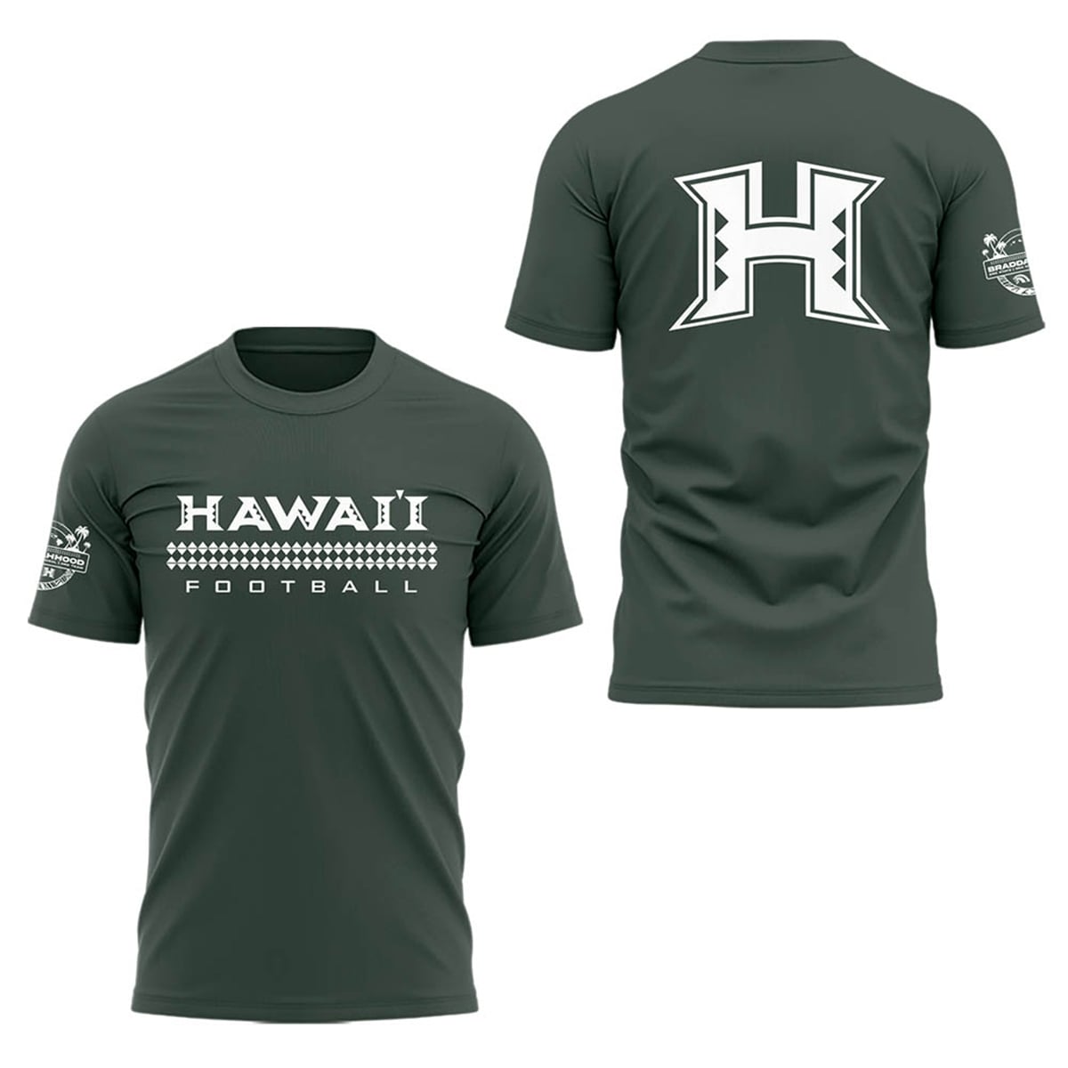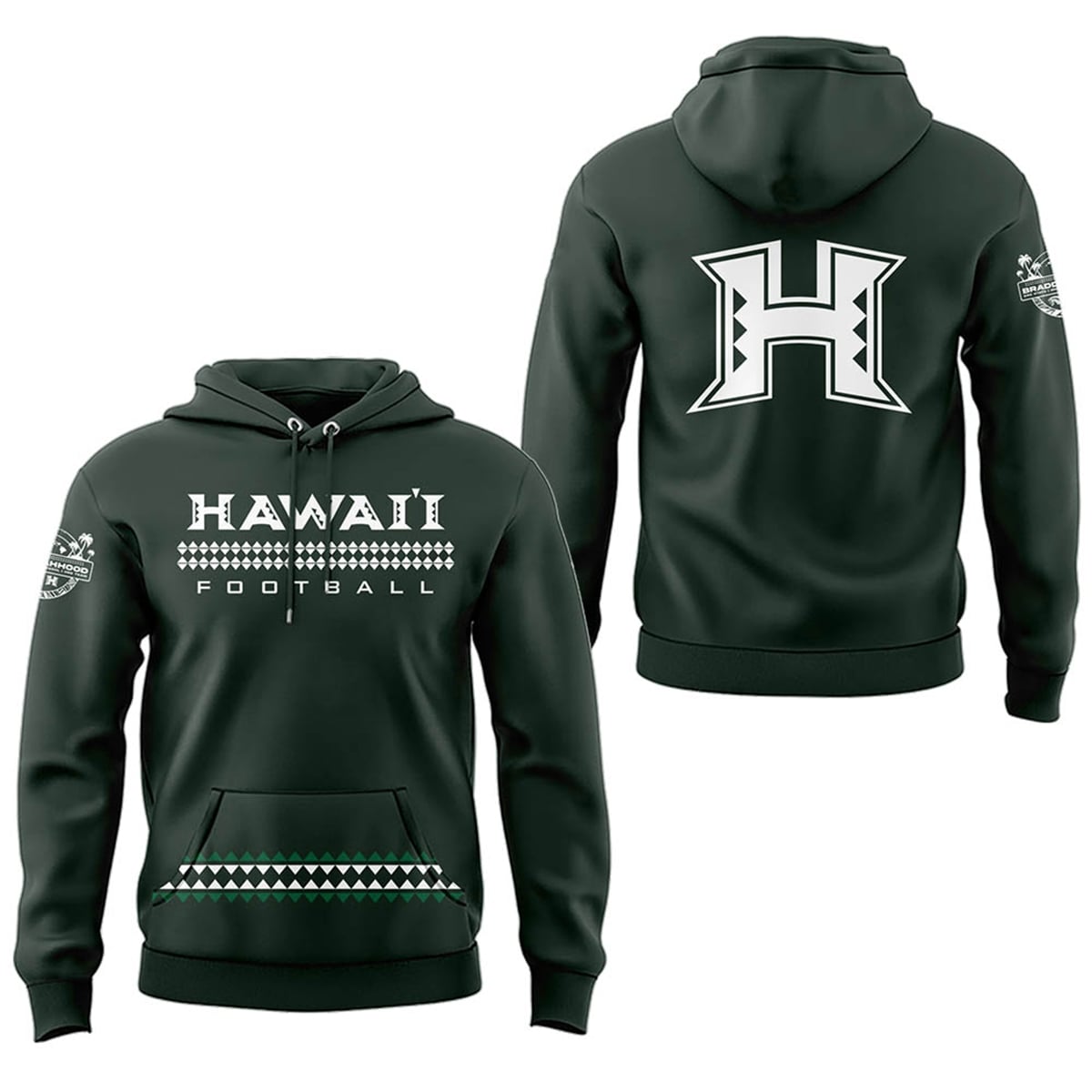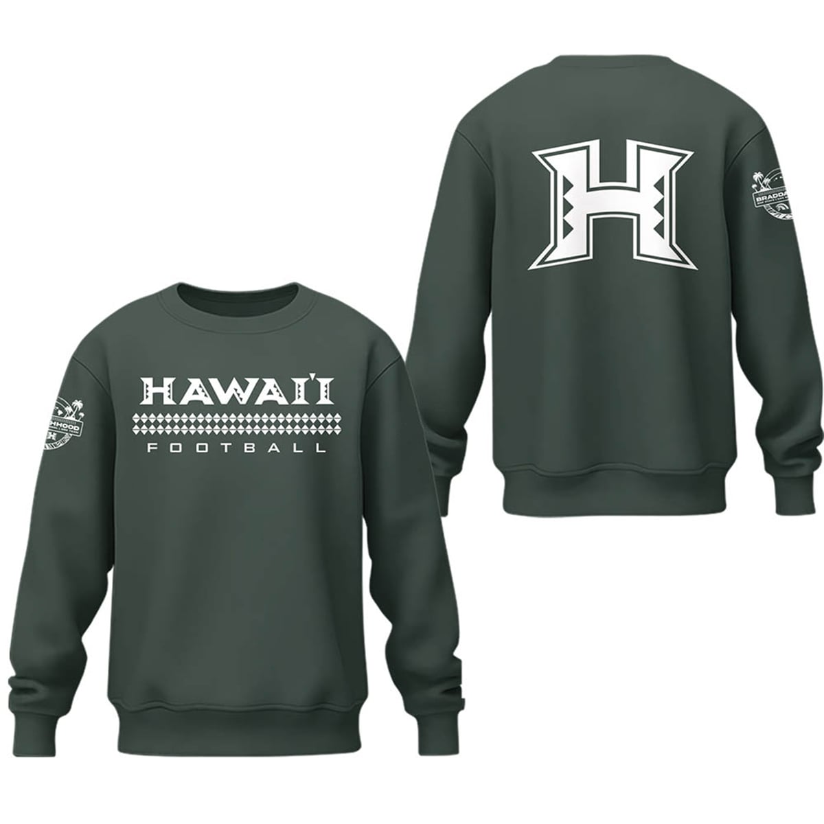 The sweatshirt is a masterclass in visual storytelling and athletic pride. Rendered in a deep, signature forest green, the front of the garment proudly displays “HAWAI’I FOOTBALL” in crisp, white, block typography. What truly sets the front graphic apart is the intricate Polynesian tribal band that perfectly intersects the text, creating a visually striking horizontal anchor. Turning the garment reveals its most commanding feature: an oversized, stylized “H” logo. This is no standard lettermark; the vertical pillars of the “H” are cut out to reveal aggressive, geometric tribal motifs. Finally, the right sleeve features an exclusive circular emblem, complete with palm tree silhouettes and the program’s foundational “Brotherhood” messaging, solidifying its status as authentic team outerwear.