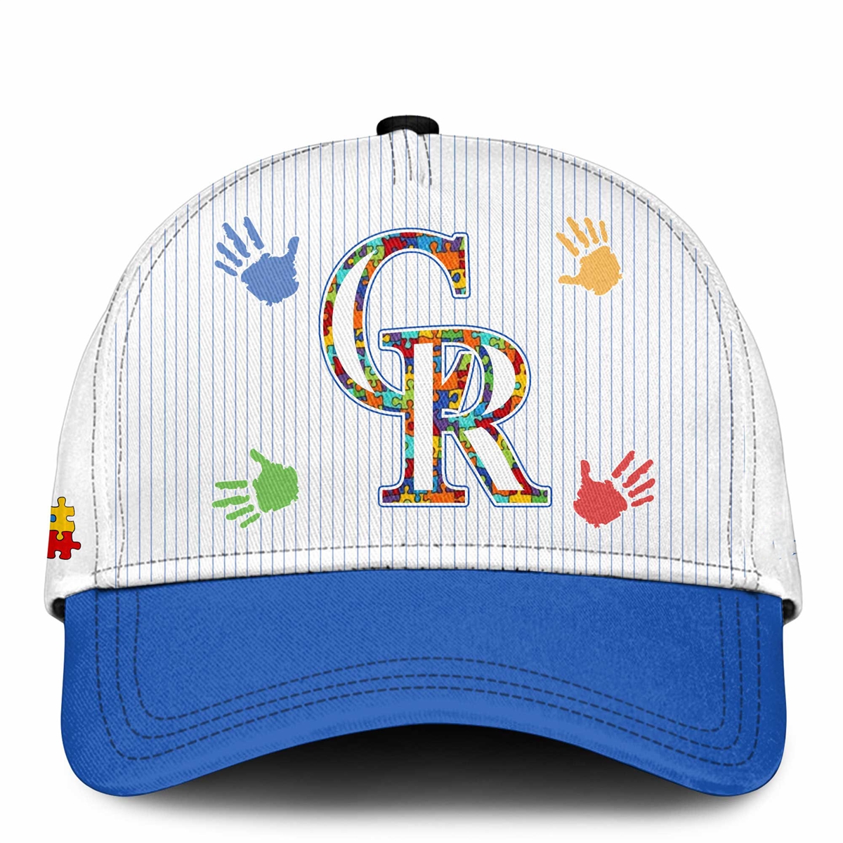 The centerpiece of the design lies in the customized typography. Both the “ROCKIES“ lettering across the chest and the “COLORADO” lettering on the back are filled with a multi-colored puzzle-piece pattern. The iconic “CR” team logo, prominently displayed on the front left and enlarged on the back, also shares this vibrant puzzle aesthetic. Adding a deeply personal touch, brightly colored handprints in shades of green, blue, orange, and red are scattered energetically across the front and back. The reverse side proudly displays the words “AUTISM AWARENESS” in large, multi-colored, eye-catching fonts, ensuring the message of the apparel is unmistakable from any angle.rges team loyalty with a powerful message of neurodiversity acceptance.