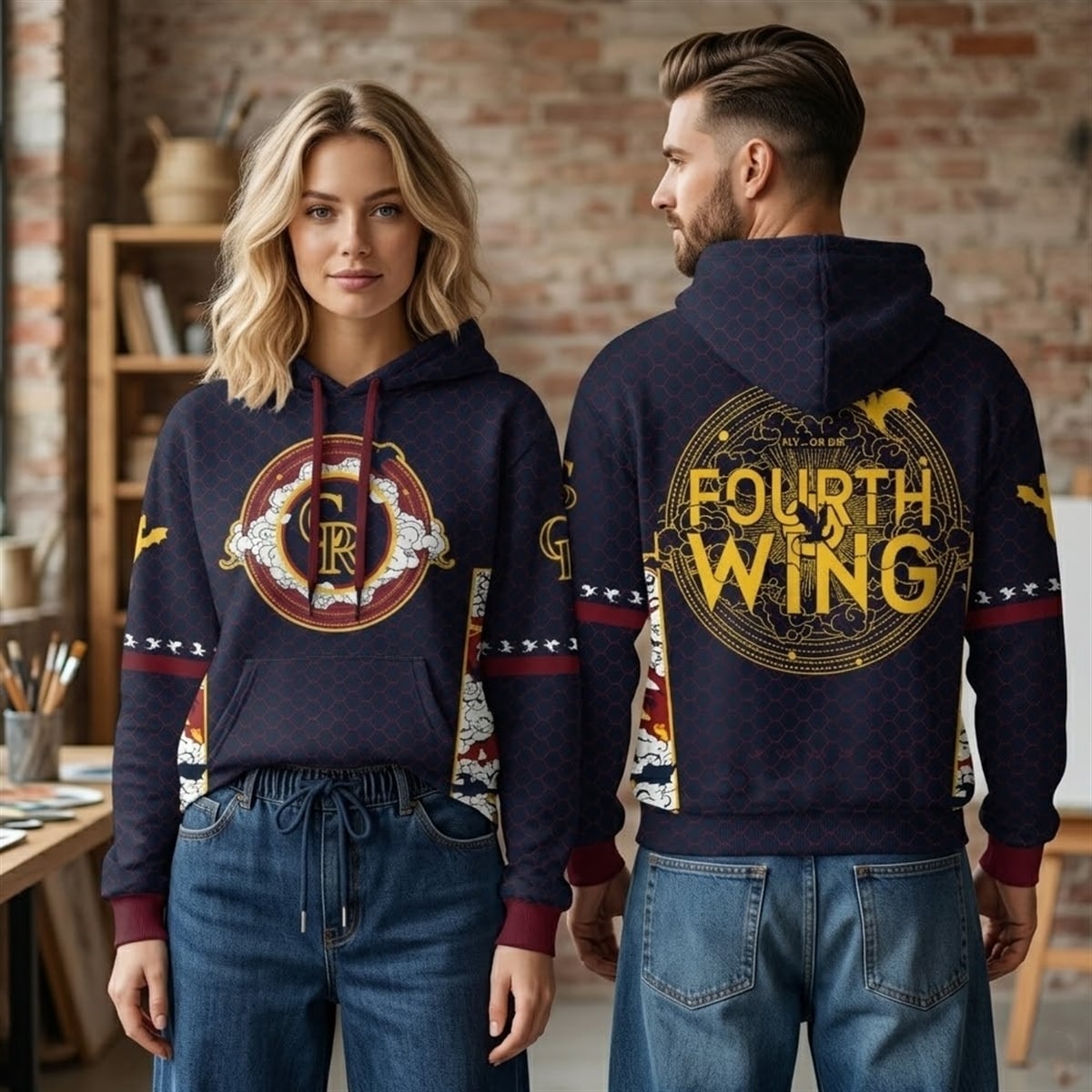 Turning to the back, the phrase “FOURTH WING” commands attention in bold, golden typography, underscored by the legendary fantasy mantra, “FLY… OR DIE.” Surrounded by celestial constellations, magical runes, and fiery dragon imagery, the design completely transforms standard sports apparel into a wearable piece of lore. The sleeves feature matching crimson and white accents, dotted with flying dragons, completing a cohesive, breathtaking look.