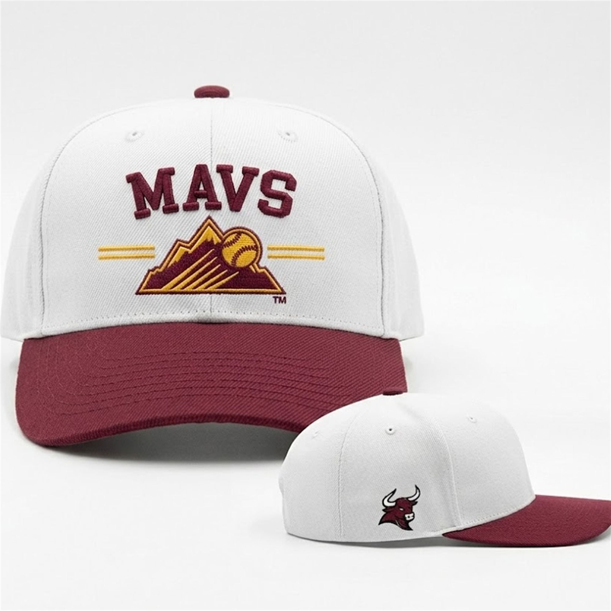 Every element of this hat carries significant visual symbolism. The golden mountain range perfectly honors the natural landscape of Colorado, acting as a visual bridge between the high-altitude home of the Rockies and the distinct western slope heritage of Colorado Mesa University. The baseball flying over the peaks represents the momentum and excitement of America’s pastime, while the bold maroon “MAVS” lettering unapologetically declares your collegiate allegiance. The addition of the fierce bull logo on the side panel is a nod to the relentless, charging spirit of the university’s student body and alumni network.