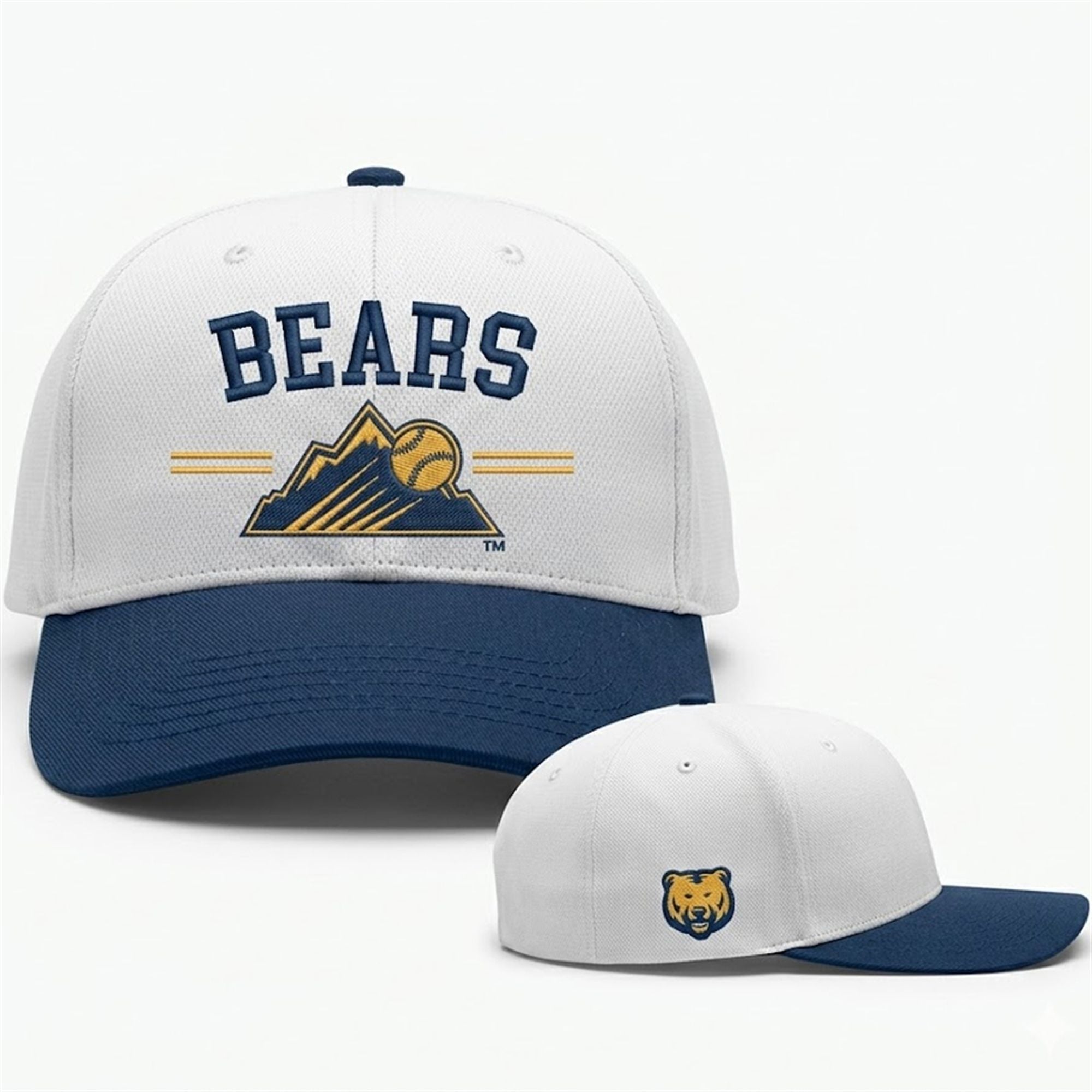 The hat is a special-edition promotional item designed for the annual collegiate series at Coors Field. The visual layout features a striking contrast, utilizing a crisp white upper crown paired elegantly with a deep navy blue bill and top button. Front and center, the word “BEARS” is presented in bold, athletic navy lettering. Just below the text, an intricate graphic displays a majestic mountain range overlapping with a dynamic yellow-gold baseball, perfectly capturing the essence of the region and the sport. As an added touch of collegiate identity, the side panel features the iconic, fierce UNC Bear head logo, creating a cohesive and visually stunning tribute to the university.