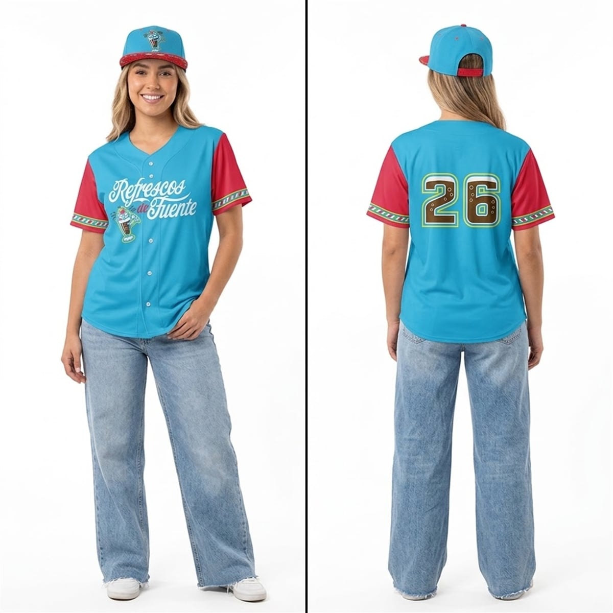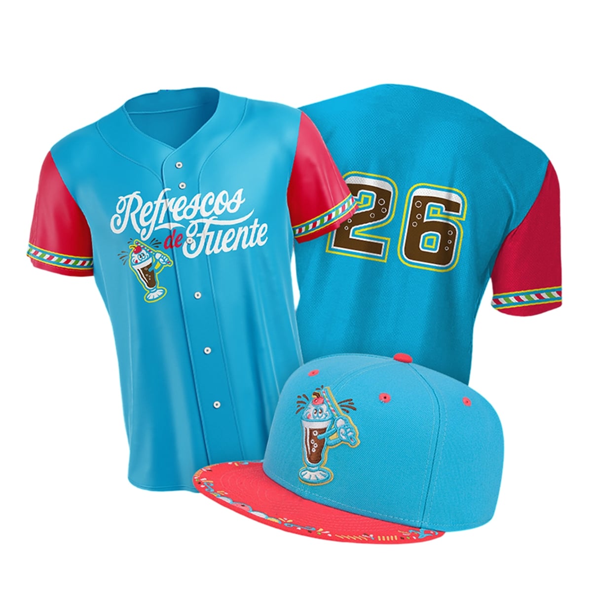 The set represents a spectacular fusion of sports entertainment and cultural celebration. Released as part of the widely acclaimed Copa de la Diversión initiative, this specific collection embraces the lively spirit of the local community while paying homage to the universally beloved tradition of sharing a refreshing drink at the ballpark. The front of the jersey features a beautifully scripted “Refrescos de Fuente” wordmark, beautifully complementing the bold, large-scale numbering on the back. The accompanying cap perfectly mirrors this aesthetic, bringing the entire look together with its contrasting brim and exquisitely detailed front logo.