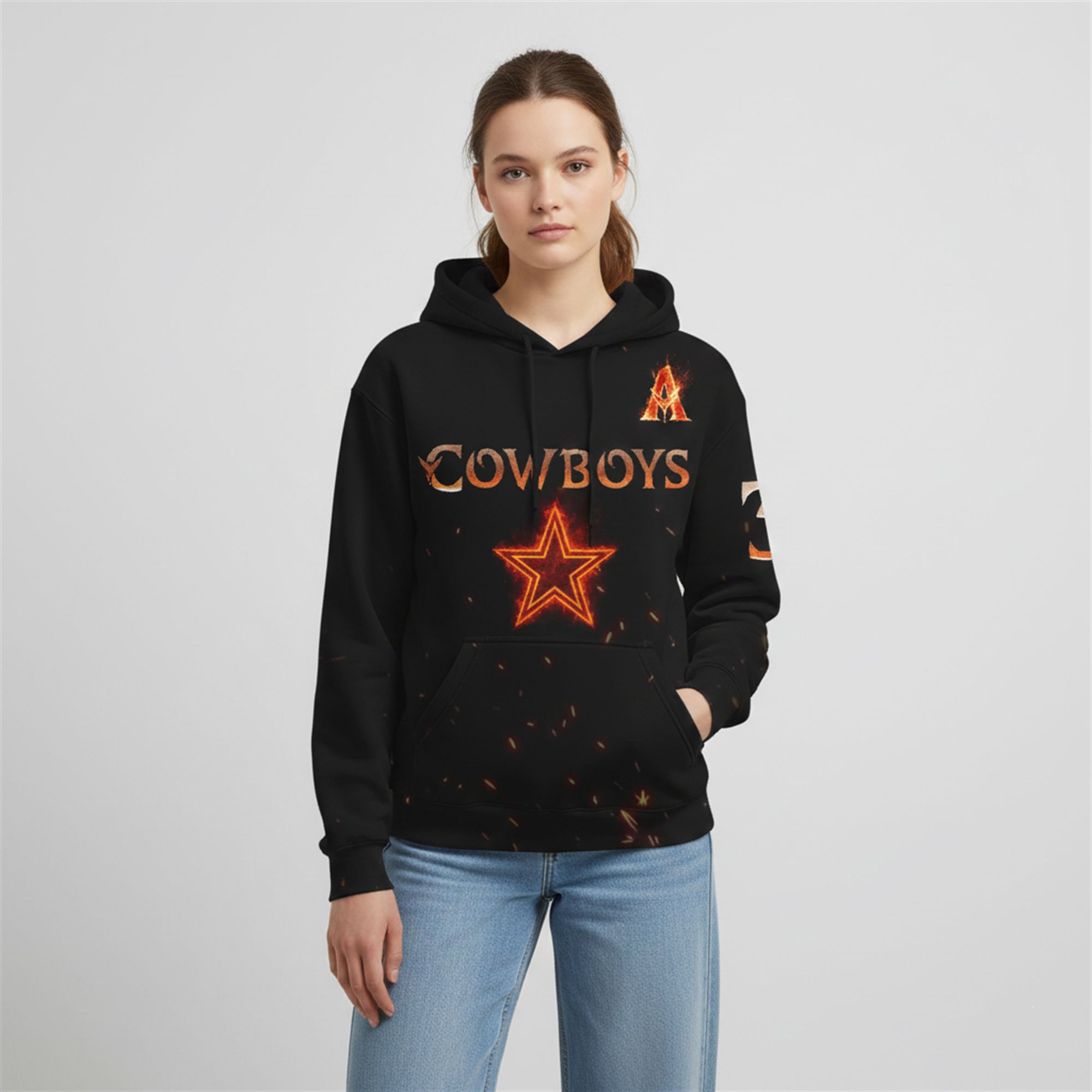 The hoodie is a masterclass in visual storytelling. The front features the classic “COWBOYS” wordmark reimagined with a rugged, battle-worn texture, accompanied by a blazing Dallas Star that looks as if it was forged in the volcanic regions of Pandora. The chest also proudly displays a subtle, flaming “A” logo, hinting at the power within.