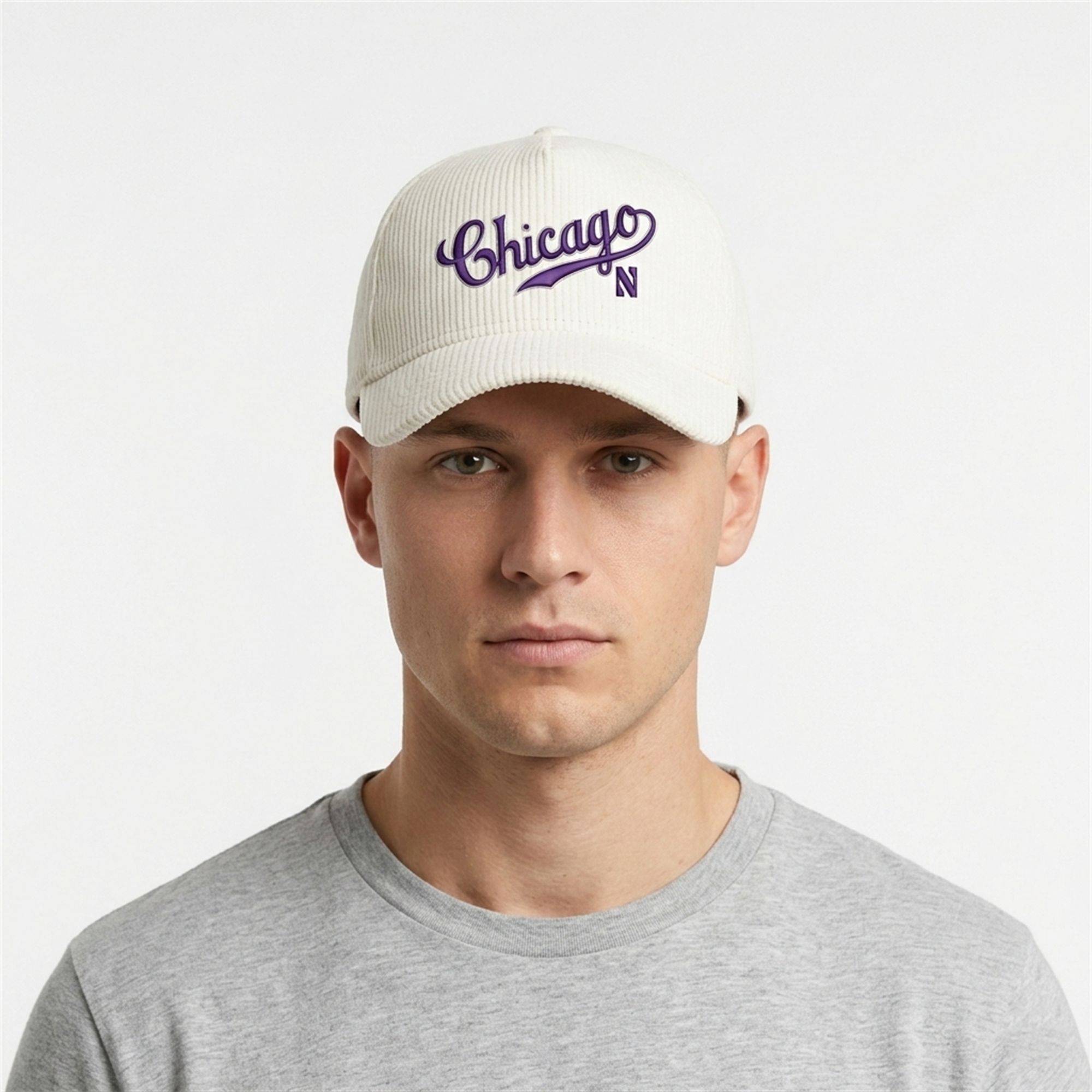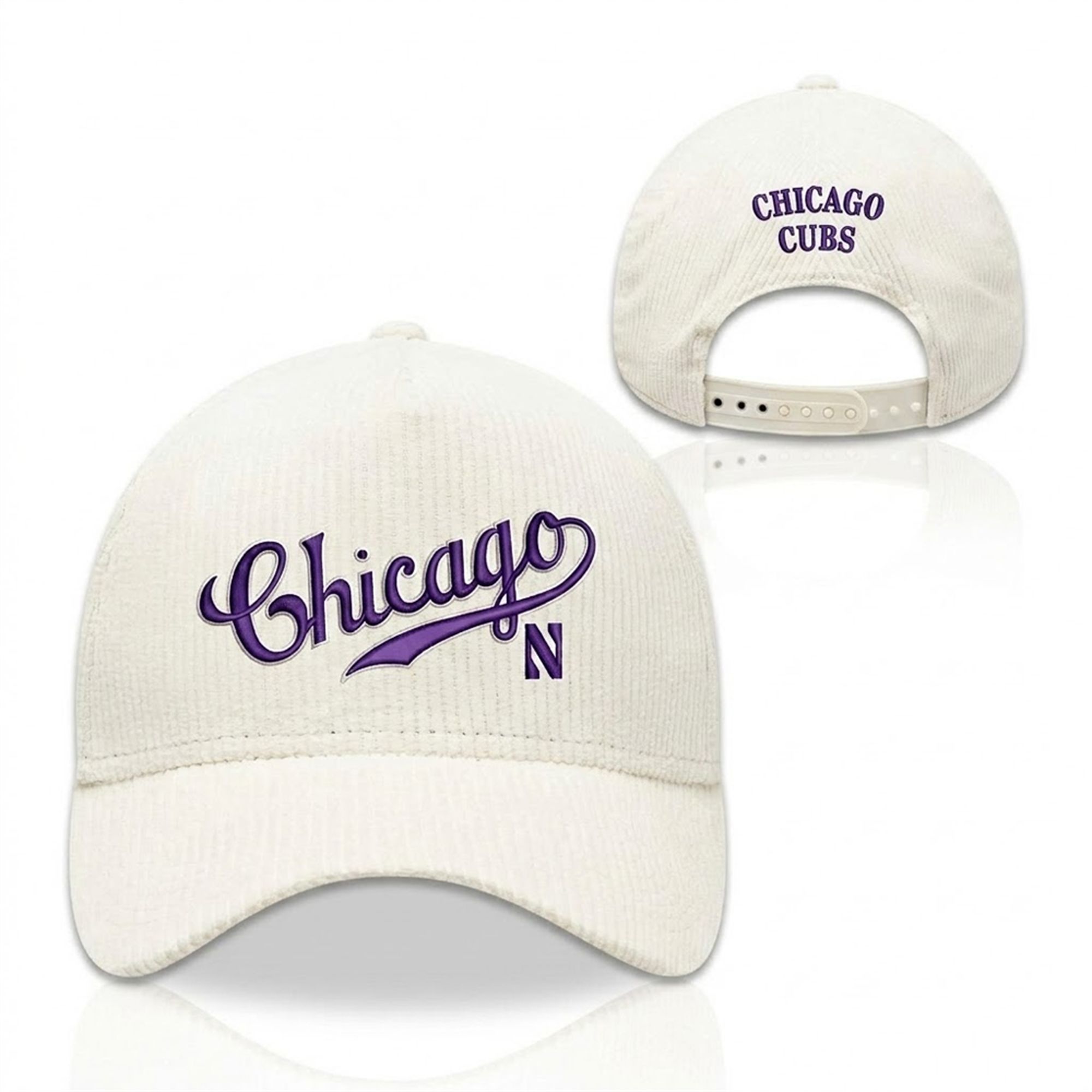 The cap is a visual standout in the world of fan apparel. It features a clean, off-white base that allows the bold, purple to truly pop. The front of the hat displays “Chicago” in an elegant, flowing script, underlined by the unmistakable block “N” that represents the Northwestern Wildcats. Turning the hat around reveals “CHICAGO CUBS” proudly arched across the back above an adjustable snapback closure. This thoughtful design seamlessly blends the visual identity of both teams into one cohesive, stylish accessory.