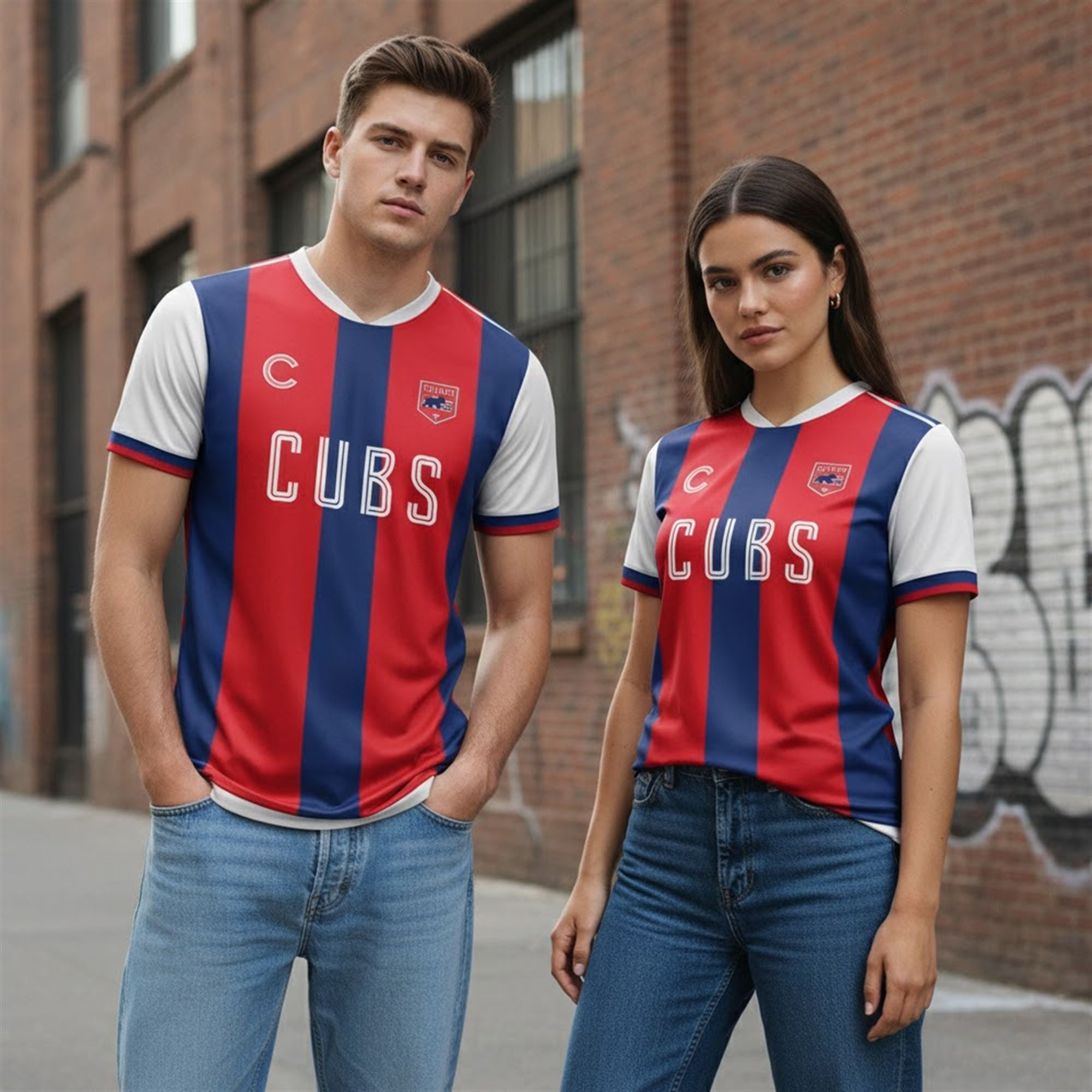The jersey represents more than just a promotional item — it’s a cultural crossover that celebrates Chicago sports in a fresh, unexpected way. Featuring bold vertical striping in classic Cubs colors, “CUBS” across the chest, and “CHICAGO 26” on the back, this jersey captures the energy of global football while staying rooted in Wrigley tradition.