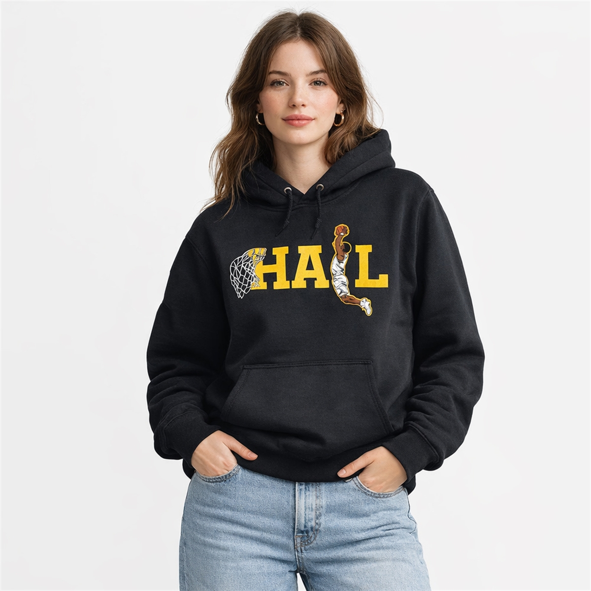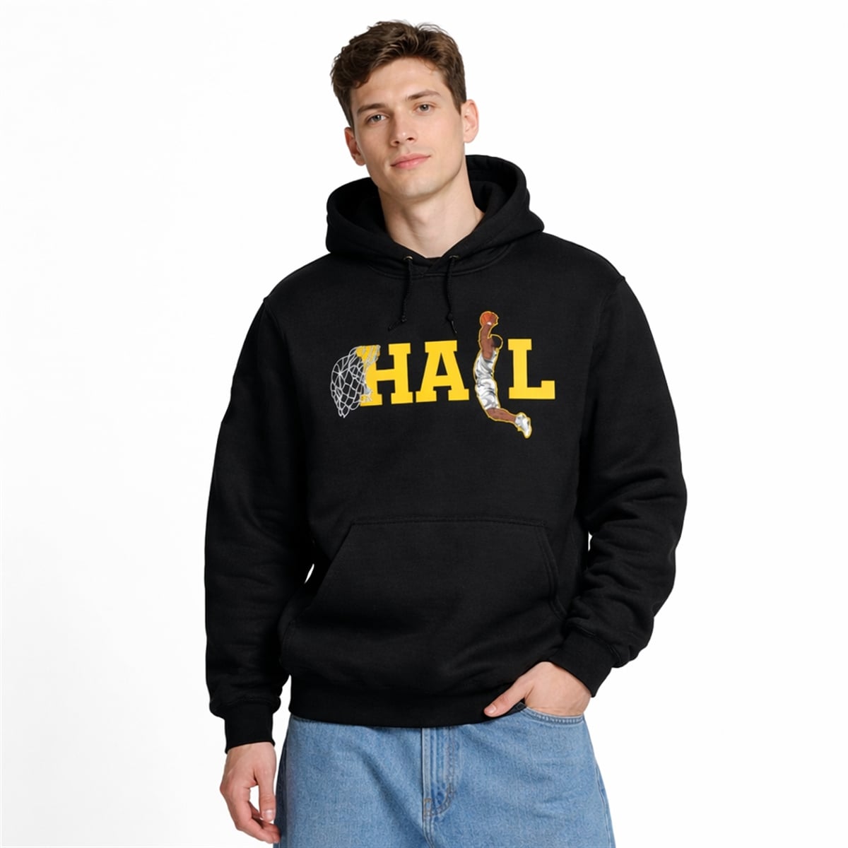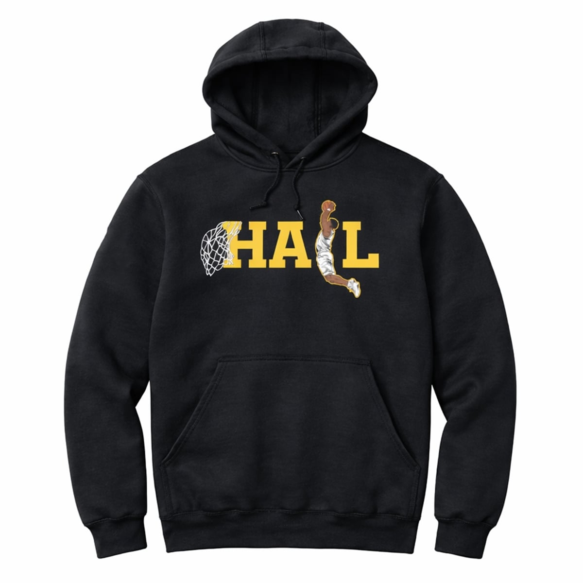 The hoodie is far more than just a standard piece of fan merchandise; it is a cultural artifact from a legendary sports season. The design centers around a bold, striking visual: the word “HAIL” emblazoned across the chest in iconic college yellow against a deep, sleek black background. However, the true genius lies in the typography. The letter “H” features an attached basketball net, and the letter “I” is entirely replaced by an illustration of a dynamic basketball player caught mid-air, throwing down a vicious slam dunk.