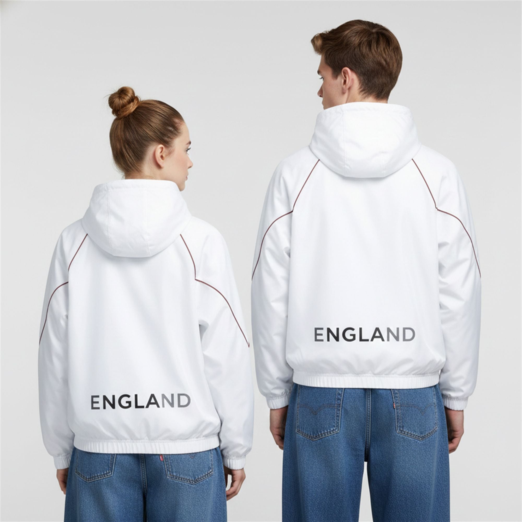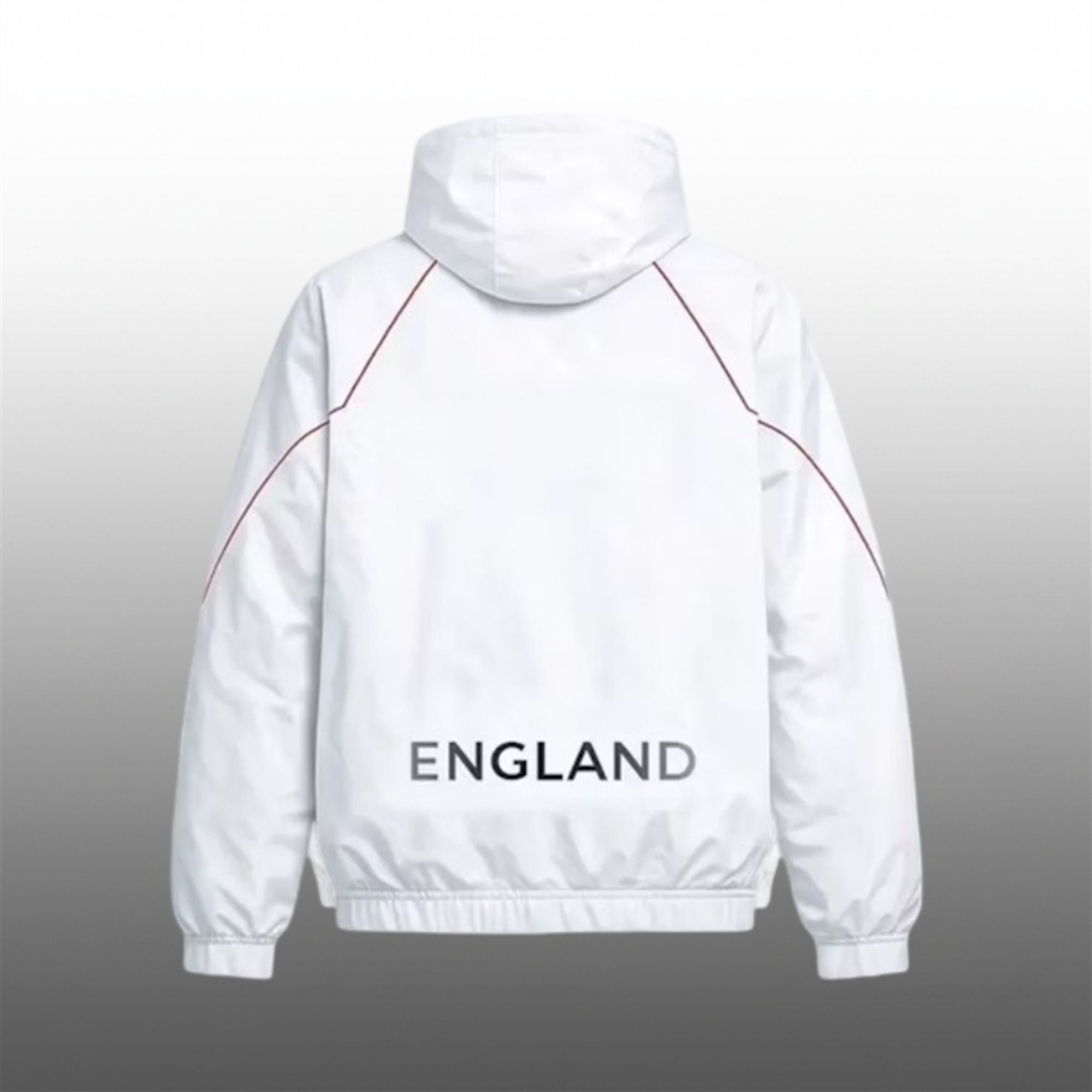 This Marty Supreme England Windbreaker is a masterclass in retro-inspired luxury. It features a crisp white body accented by bold red piping that contours the shoulders, evoking the classic table tennis warm-ups of the 1950s.
