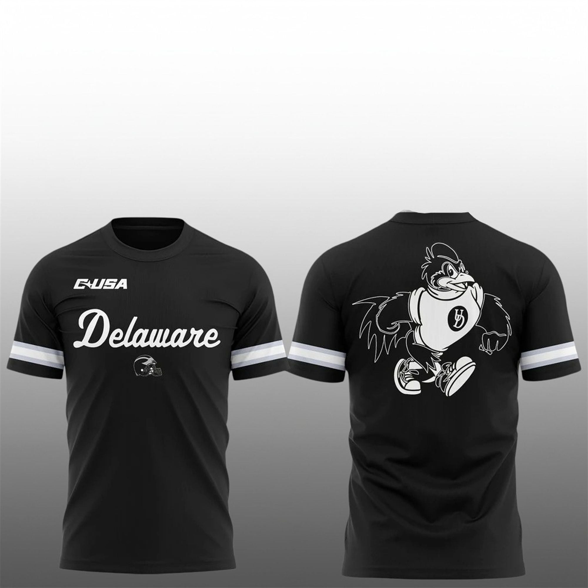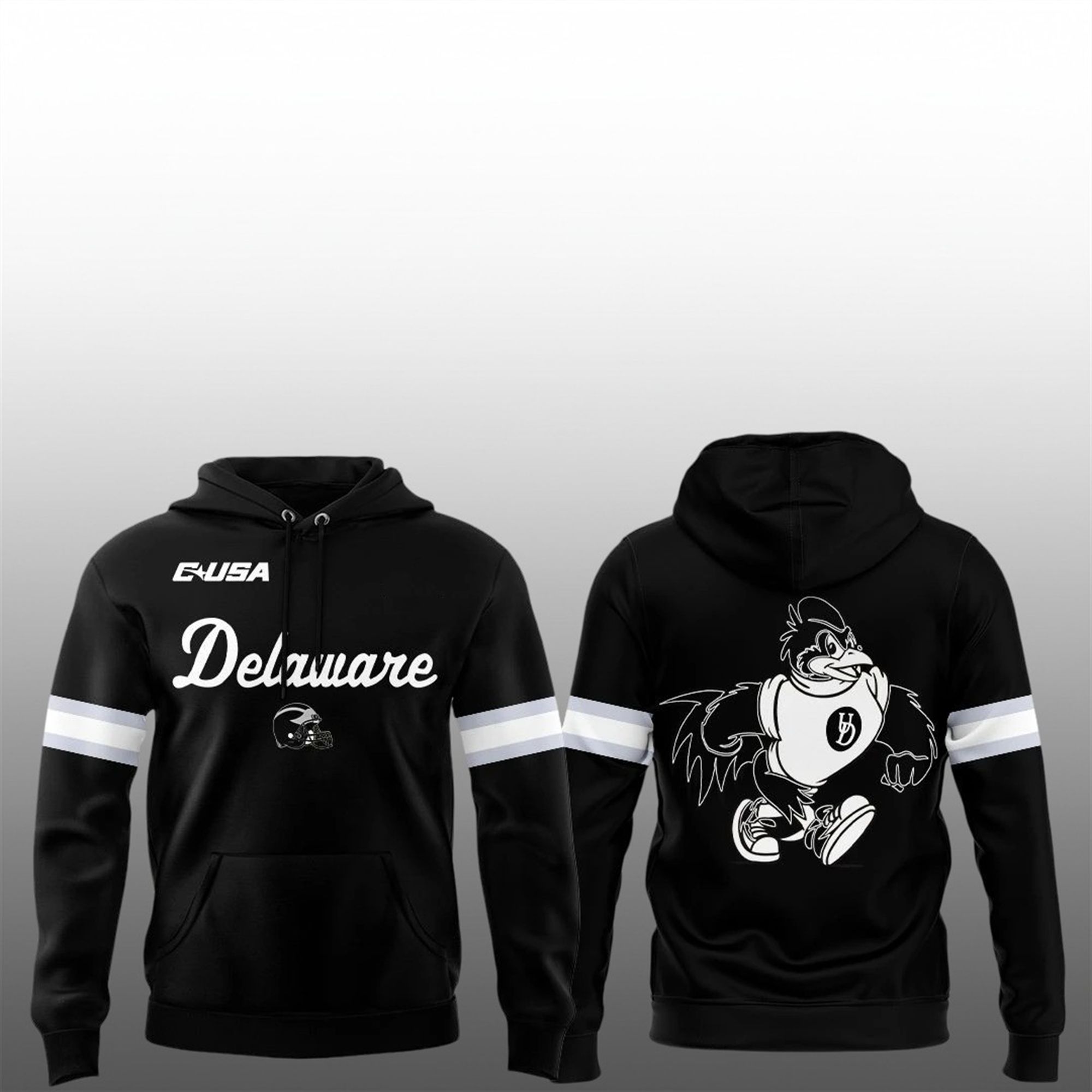 The design departs from the standard royal blue, opting for a sleek, aggressive Midnight Black base. The chest features a classic script “Delaware” wordmark paired with the team’s signature winged helmet icon and—most importantly—the C-USA logo, marking the university’s arrival on the national stage. The back of the hoodie is dominated by a massive, high-definition line-art graphic of YouDee, the legendary Blue Hen mascot, strutting with confidence.