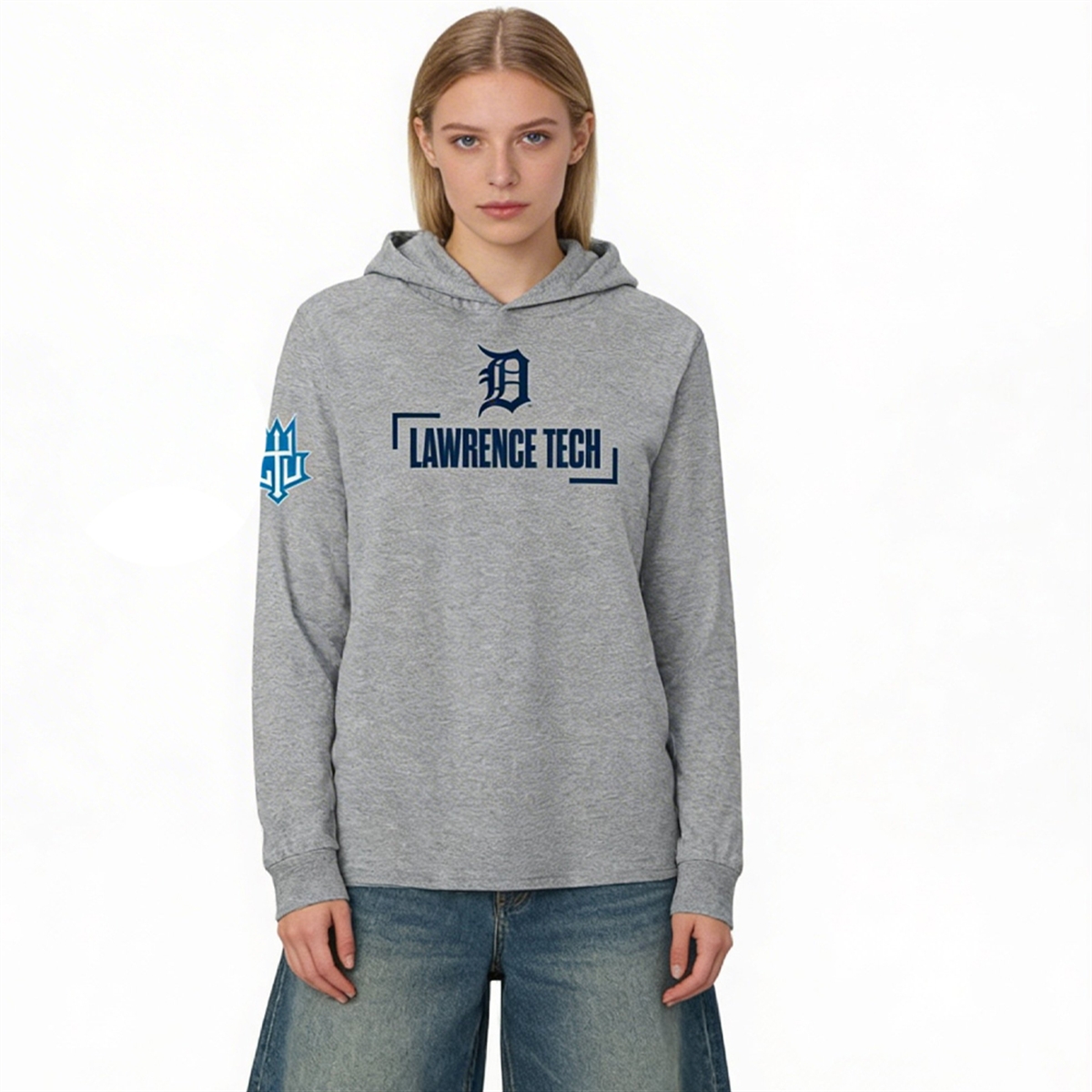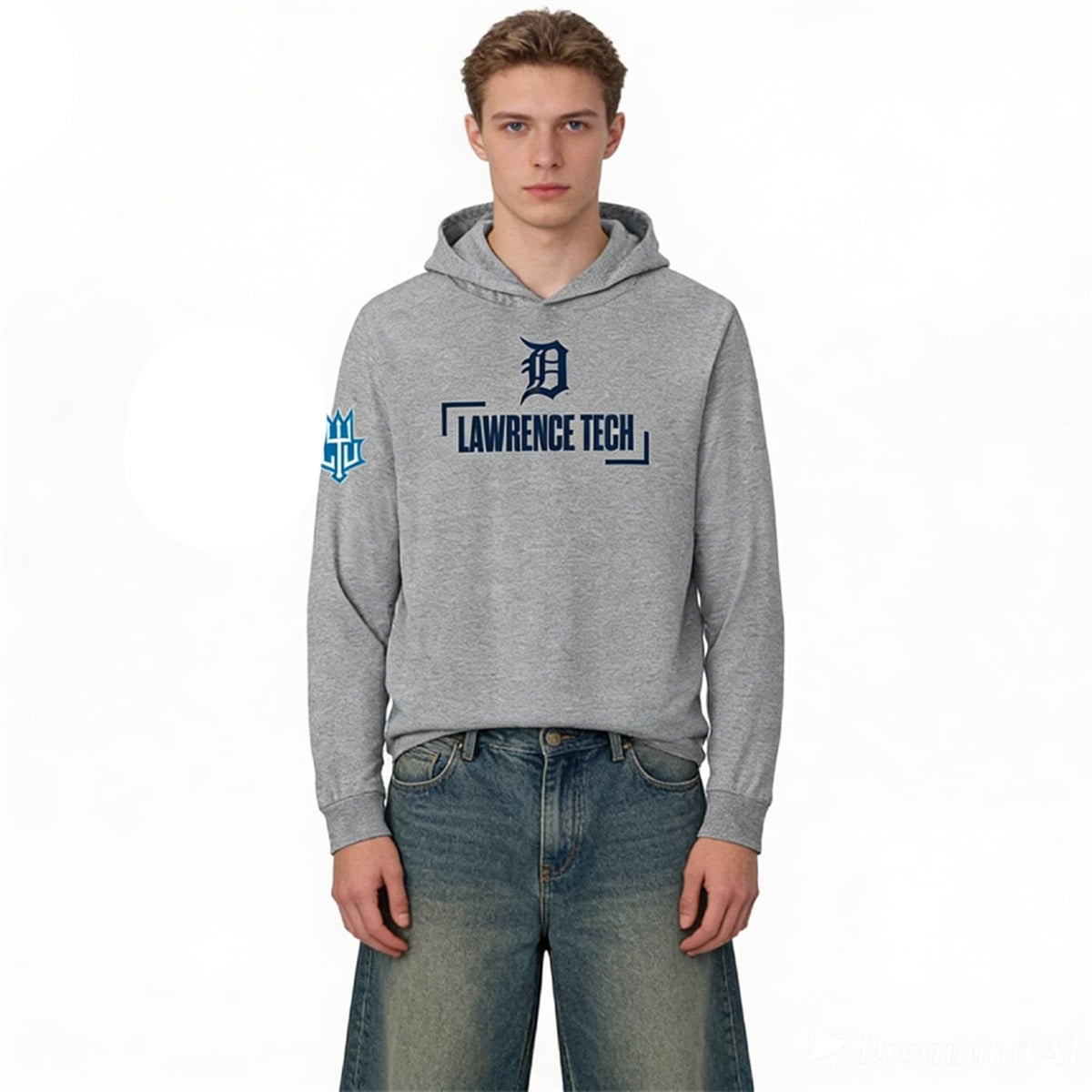 The hoodie is a visually compelling piece of fan apparel designed to celebrate a specialized collaboration between Detroit’s hometown baseball team and Lawrence Technological University. The aesthetic focuses on a clean, athletic grey backdrop that makes the prominent navy graphics pop. The chest proudly displays the universally recognized Detroit Tigers ‘D‘ hovering above a structured, modern “LAWRENCE TECH” typography block. Furthermore, the right sleeve is accented with the distinct LTU Blue Devils trident emblem, adding an extra layer of collegiate identity. This item is entirely centered around visual expression, community belonging, and commemorating the exact 2026 event.