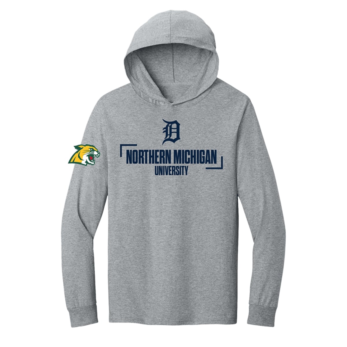 The hoodie is a visually striking promotional garment designed for a specific, highly anticipated event during the 2026 season. The design utilizes a versatile heathered grey background to make its graphic elements pop. Front and center, the iconic navy blue Detroit Tigers Old English “D” sits proudly above the bold “NORTHERN MICHIGAN UNIVERSITY” text, neatly framed by sleek, modern brackets. To complete the crossover aesthetic, the right sleeve features the vibrant green and gold NMU Wildcats logo, creating a dynamic visual balance that honors both teams equally.