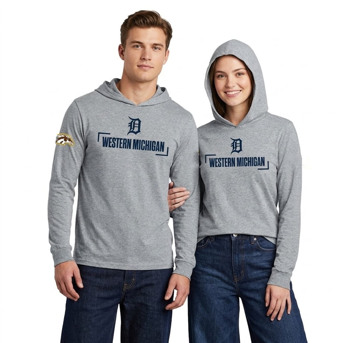 The hoodie is a specialized commemorative item designed specifically for the annual university night event at Comerica Park. Visually, the hoodie features a versatile, classic heather grey base. Front and center, the iconic navy blue Old English Detroit Tigers ‘D‘ anchors the design, sitting just above bold “WESTERN MICHIGAN” typography that is framed by sleek, modern brackets. To complete the crossover aesthetic, the recognizable WMU Bronco head logo is proudly displayed on the right sleeve, featuring its signature brown and gold colors. This strategic logo placement ensures that both affiliations are honored without cluttering the overall look.