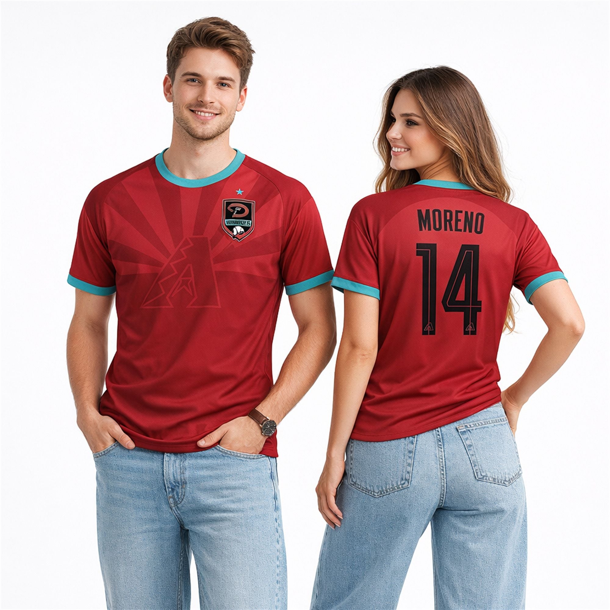 The front of the garment abandons the traditional baseball button-down format for a sleek, unified canvas. It showcases a subtle, tonal sunburst pattern radiating outward from the iconic “A” logo, paying homage to the Arizona landscape. On the upper left chest, a specially designed shield crest houses the Diamondbacks logo, mimicking the traditional emblems found on international soccer club kits. The reverse side proudly displays “MORENO” arched cleanly above the bold number “14,” utilizing a classic typography style that instantly evokes the aesthetic of legendary soccer kits.
