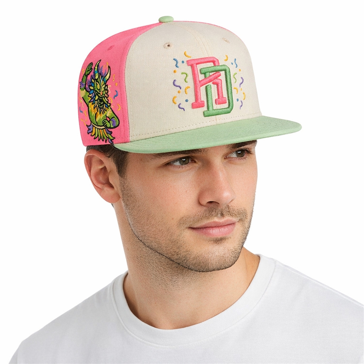 The hat is a masterpiece of cultural storytelling and visual artistry. The design features a brilliant split-color profile, utilizing a soft cream front panel, vibrant pink side and back panels, and a contrasting mint green brim. At the center, the iconic interlocking “RD” (República Dominicana) logo is stylized in striking pink and green, surrounded by playful, multi-colored confetti graphics that instantly evoke a sense of celebration.