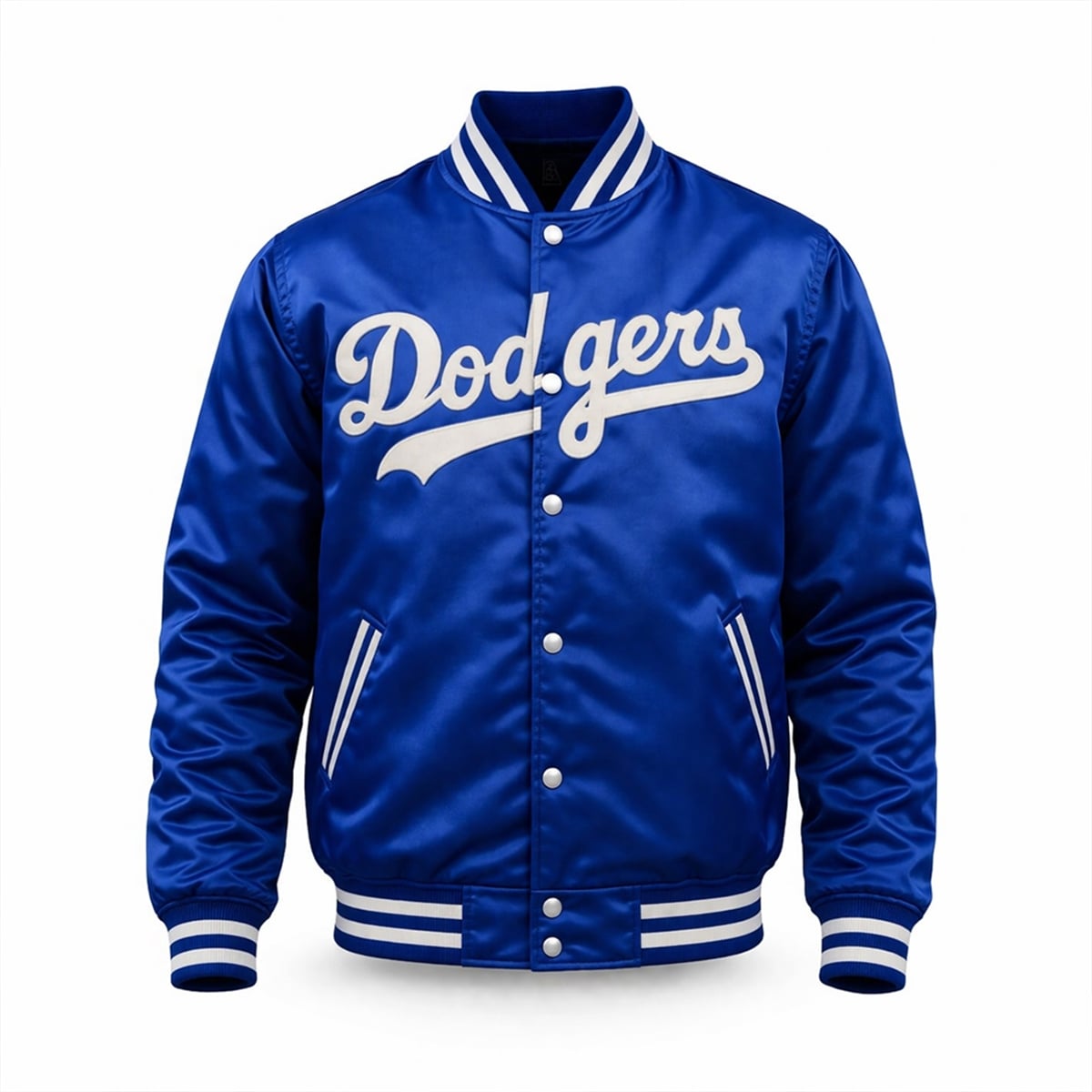 This bold bomber-style outerwear piece features a vibrant, eye-catching royal blue base that immediately commands attention in any setting. Across the chest, the iconic “Dodgers” script is prominently displayed in crisp white, flowing typography, perfectly mirroring the timeless visual identity of Los Angeles baseball. The front utilizes a classic snap-button closure, punctuated by sleek white hardware that adds a sharp, satisfying contrast to the deep blue background. Finishing the tailored athletic profile are the vividly striped collar, cuffs, and hemline, meticulously patterned with distinct blue and white lines that frame the garment beautifully. Slanted front welt pockets maintain the sleek, streamlined shape of the piece, ensuring the overall design remains as visually balanced as it is culturally significant.