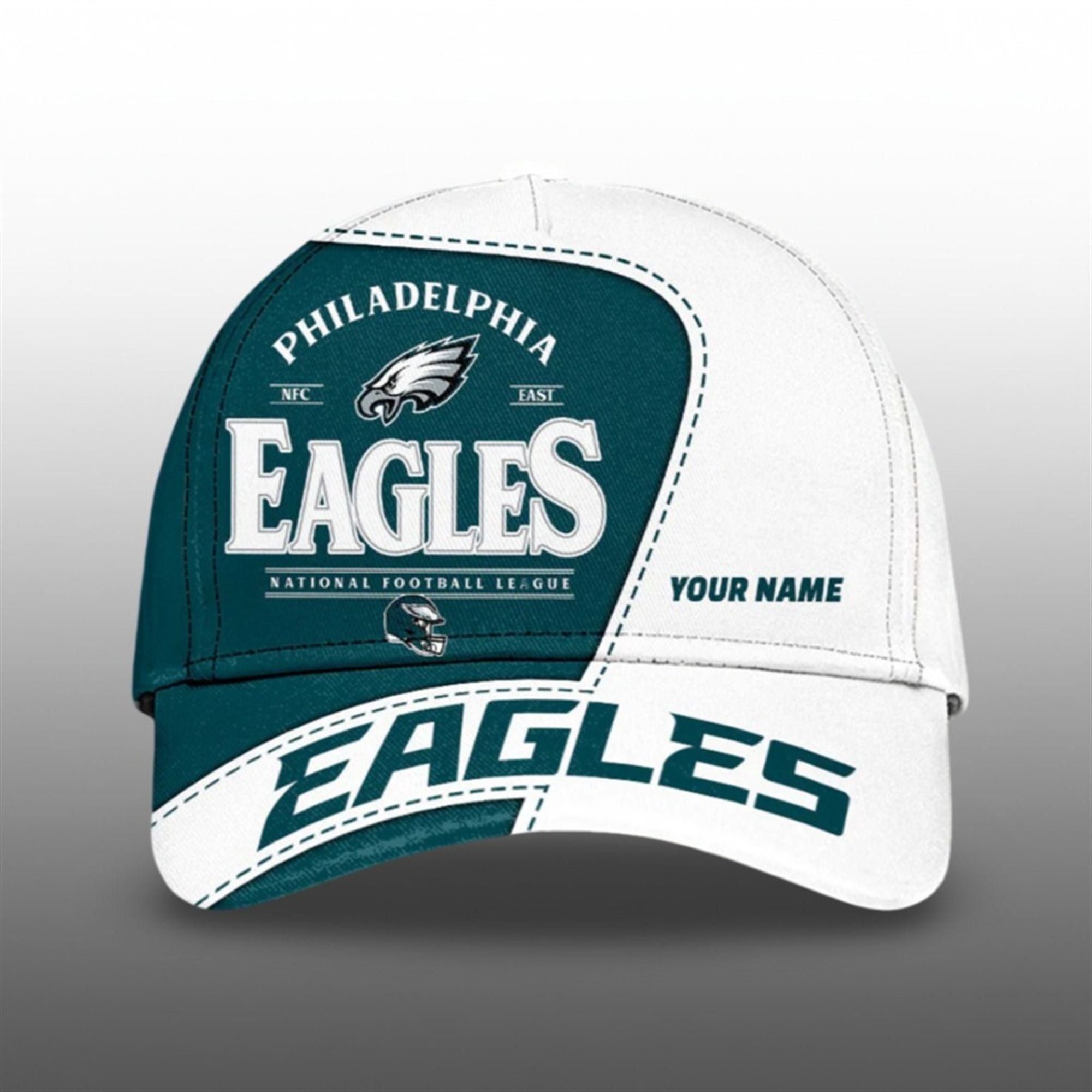 The front panel proudly displays the “Eagles” wordmark in bold, flanked by the “NFC East” designation and the iconic Eagles logo. Below the main graphic, the “League” text adds an authentic touch, while a secondary helmet logo reinforces your team allegiance. The brim continues the dynamic design with an oversized “Eagles” text graphic that demands attention.
